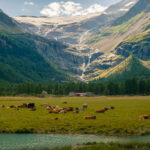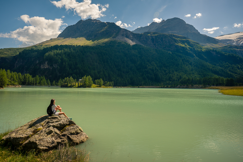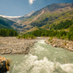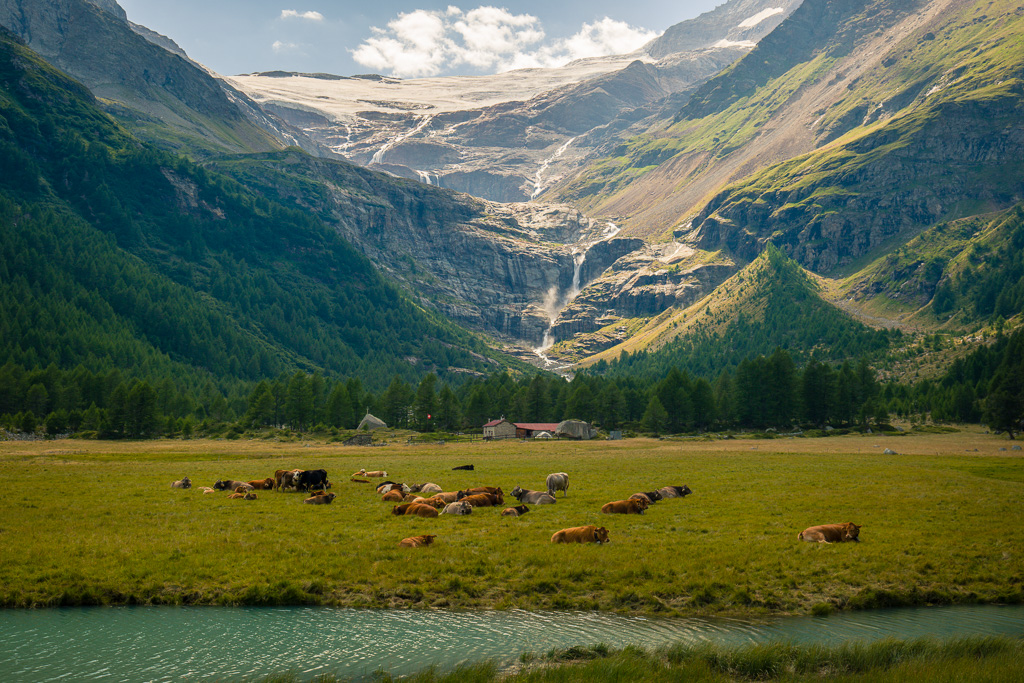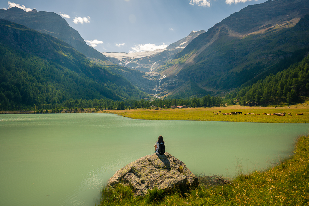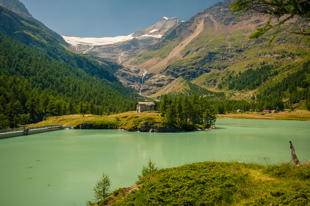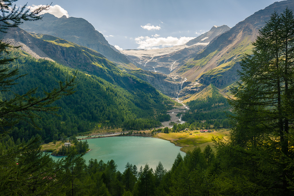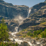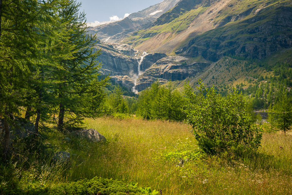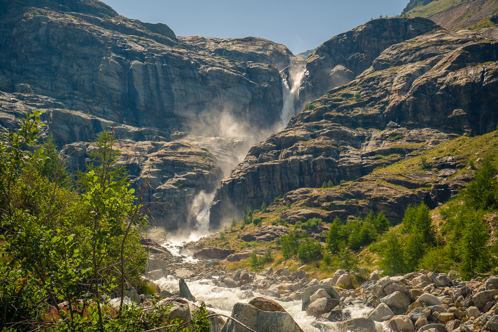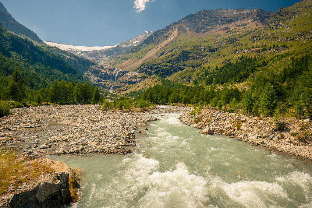 Von der Alp Grüm zum Lagh da Palü und etwas weiter am reissenden Bach hinauf zum imposanten Wasserfall, der vom Gletscher des Piz Palü herabstürzt.