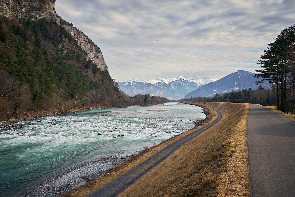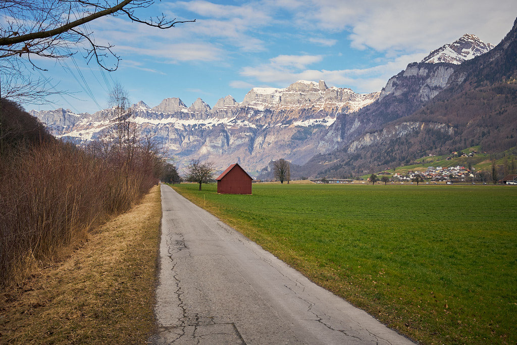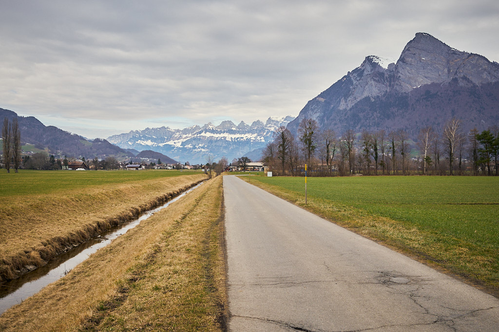 Tatsächlich stellte der Wind heute kein Hindernis dar. Die Temperatur war zwar sehr frisch, aber ebenfalls angenehmer als beim letzten Mal. So gelangte ich zügig auf Radwegen dem Rhein entlang an Landquart vorbei nach Bad Ragaz und weiter nach Vilters und Mels.