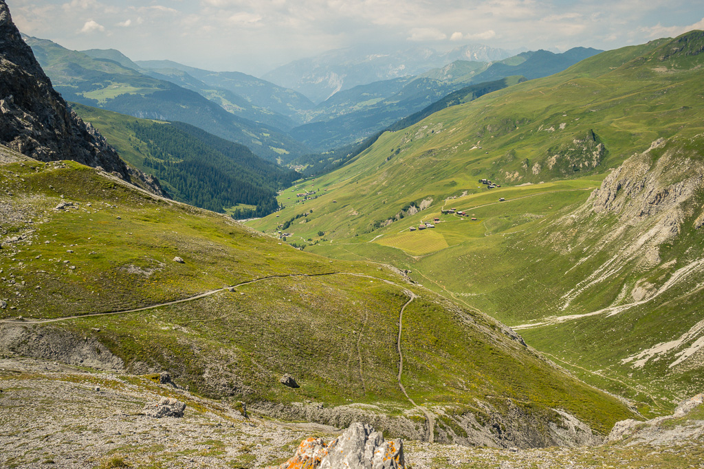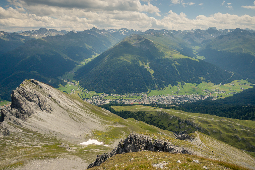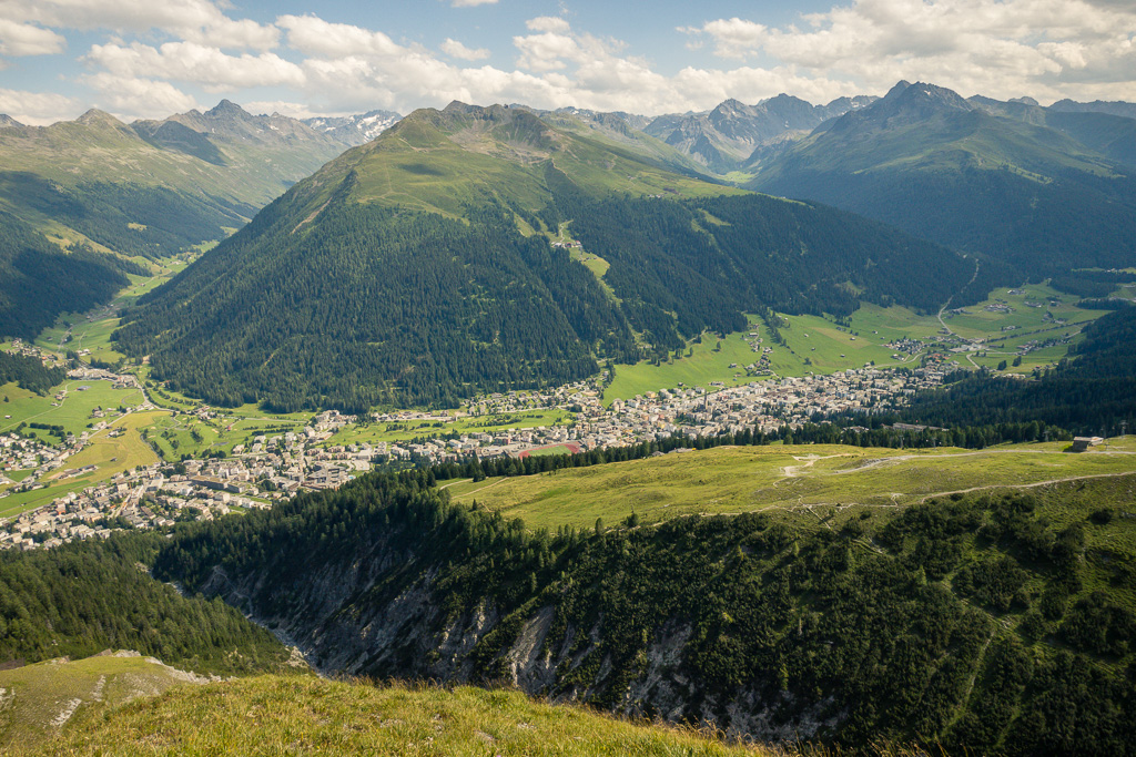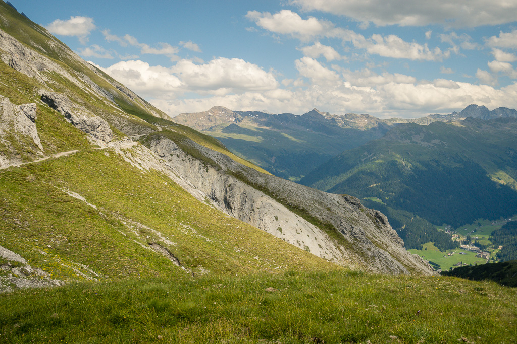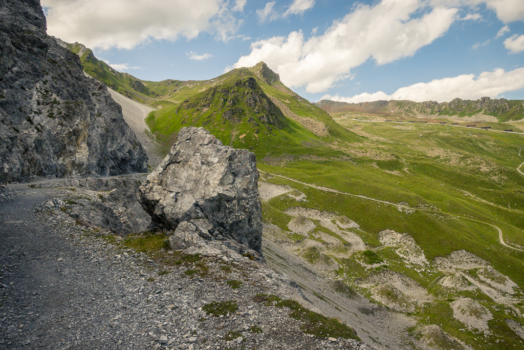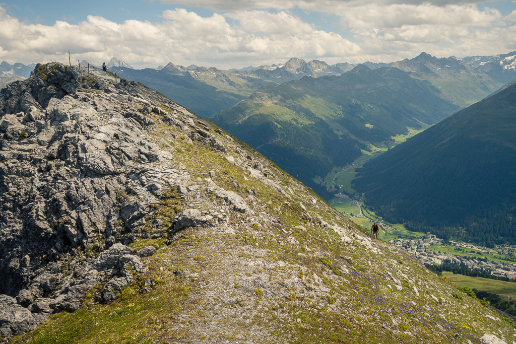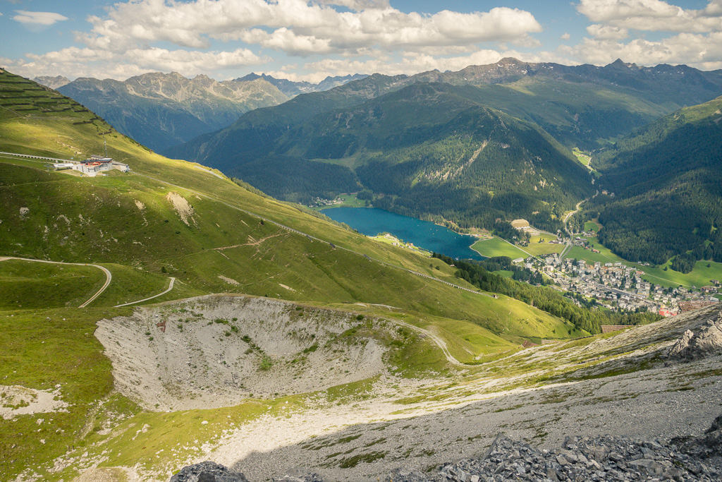 Auf demselben Weg zurück zum Strelapass. Beim Restaurant nun auf dem Felsenweg flach dem Hang entlang um das Schiahorn herum ins benachbarte Dorftälli und zur Station Höhenweg der Parsennbahn. Von hier Abstieg über die Büschalp zurück nach Davos Dorf oder Davos Platz (oder Fahrt mit der Parsennbahn nach Davos Dorf hinunter).