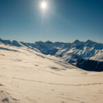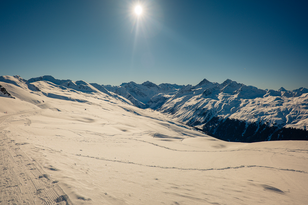 Mit der Seilbahn von Davos-Platz auf das Jakobshorn. Gleich hinter der Bergstation beginnt der langgezogene Ziehweg der Skiabfahrt «Müli», der auch von Fussgängern als beliebter Winterwanderweg bis zum Stadler See begangen wird.