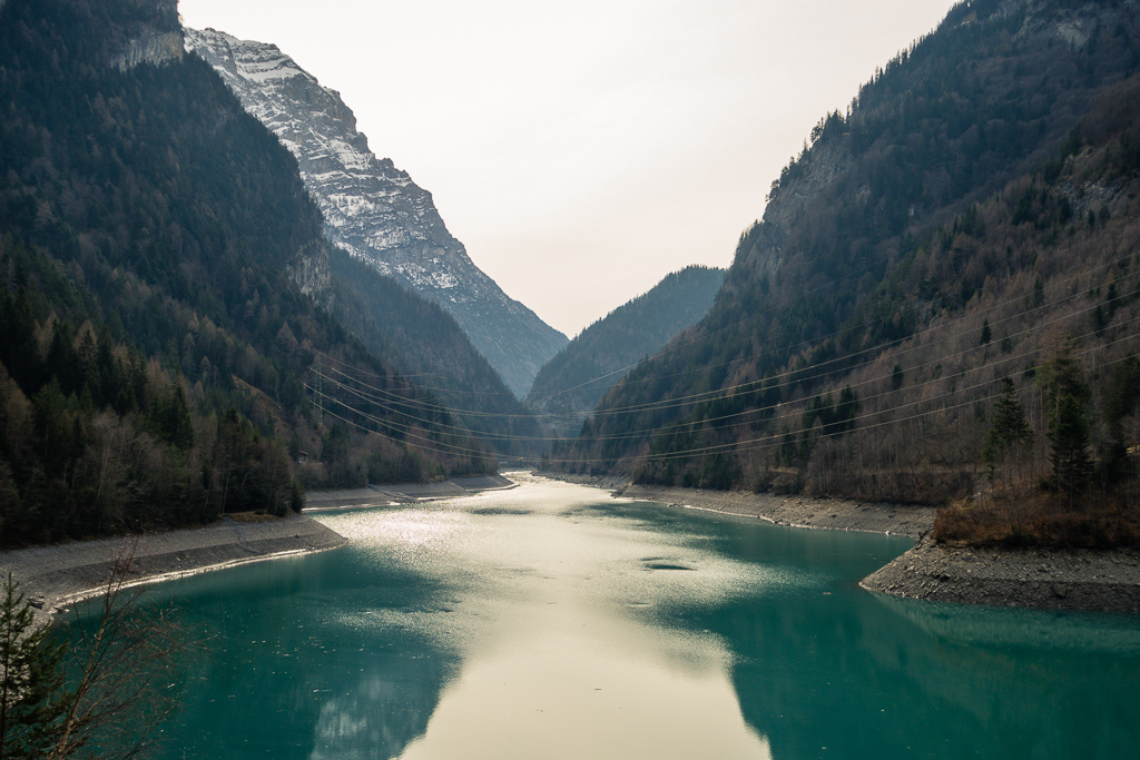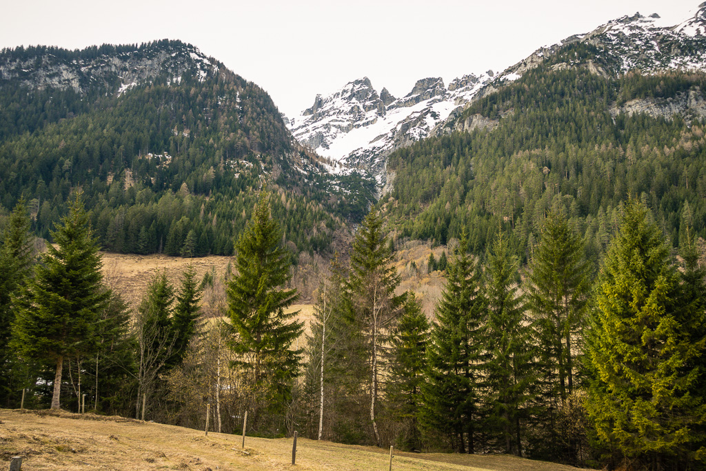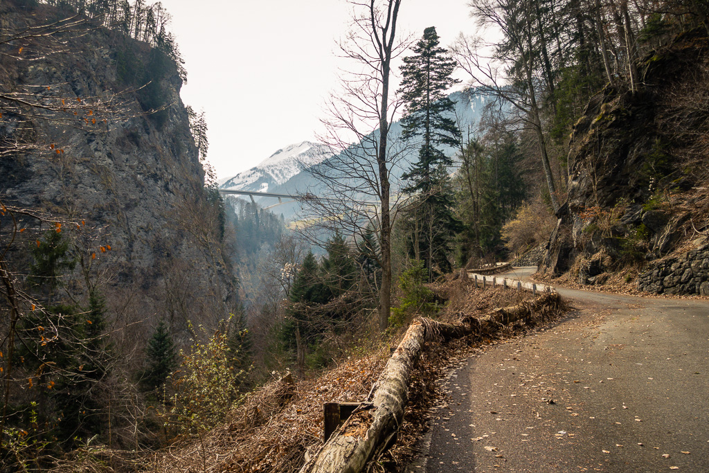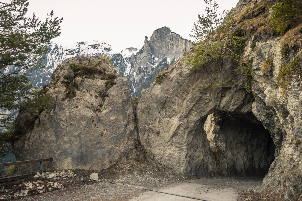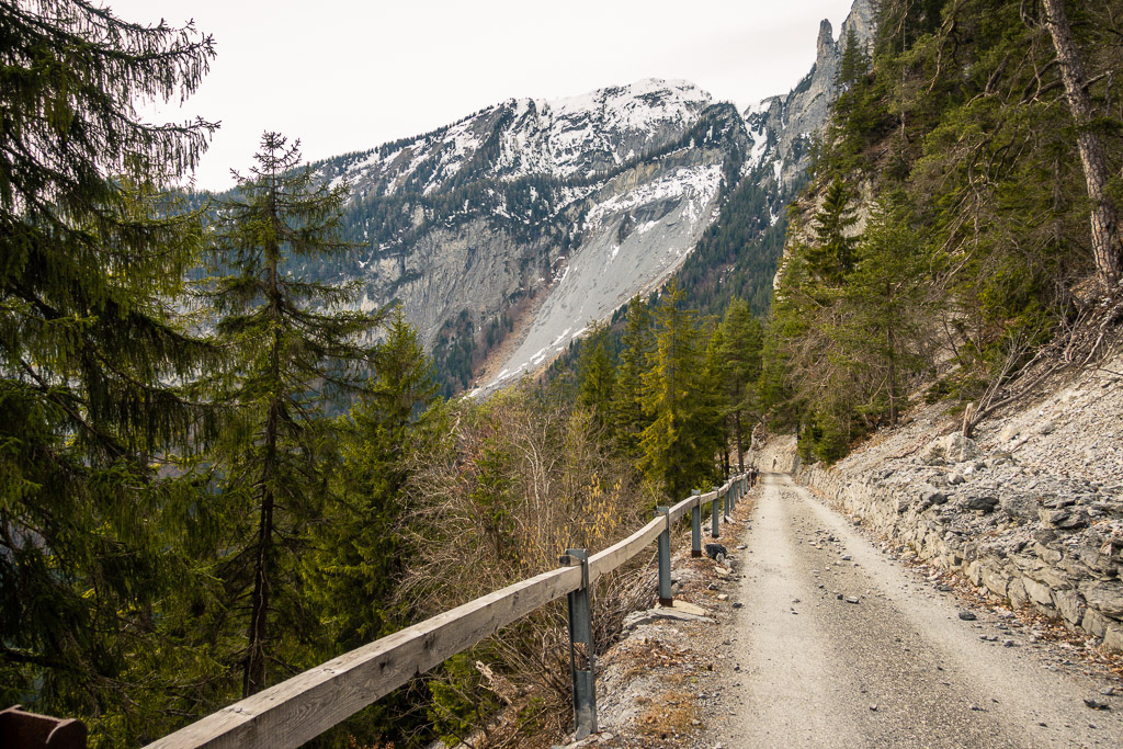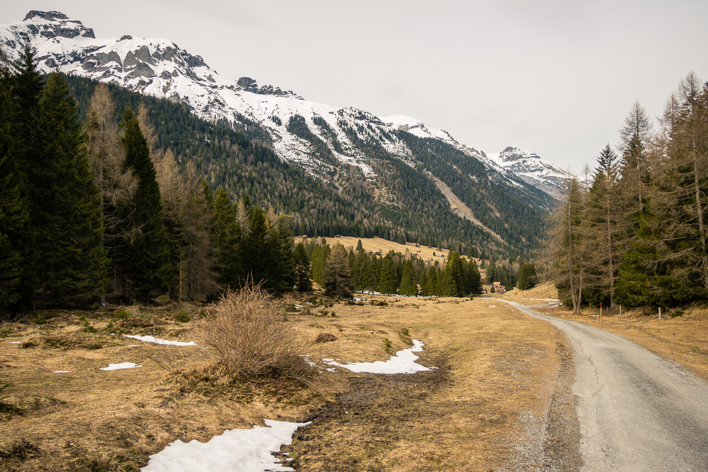 Ich entschloss mich daher, in Bad Ragaz zu starten, möglichst weit bis zur Schneegrenze hinaufzufahren und notfalls auf gleichem Weg wieder nach Bad Ragaz zurückzufahren. Vor Ort stellte ich aber fest, dass das Taminatal überraschend schneefrei war. Das erste Teilstück von Bad Ragaz auf der alten Strasse nach Valens war ein Vergnügen, da für Autos gesperrt. Danach ging es weniger steil nach Valens und Vättis weiter. In Vättis begann der langgezogene, nicht sehr steile Aufstieg zum Kunkelspass. Trotz zunehmender Höhe war immer noch erstaunlich wenig Schnee zu sehen. Am Kunkelspass schliesslich lag Schnee auf den Hängen, der Alpweg war aber durchgehend schneefrei und problemlos mit dem Gravelbike zu befahren.