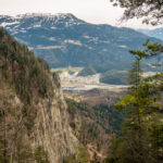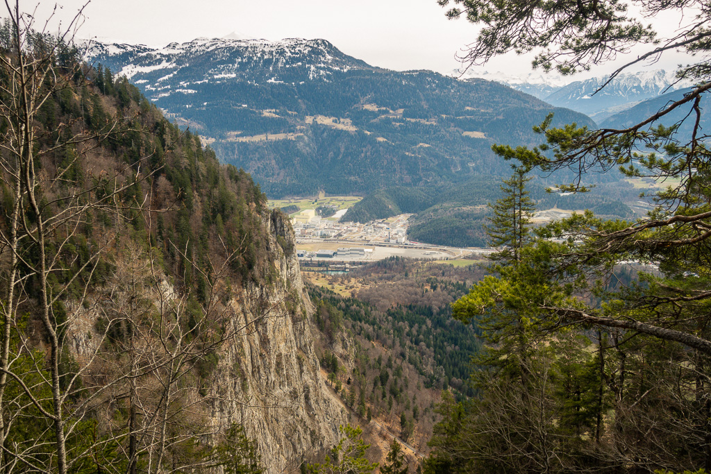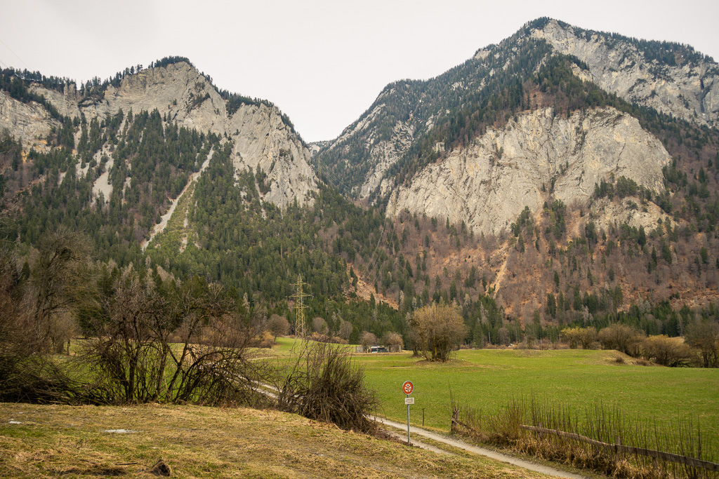 Im Dorfzentrum vom Tamins begann der lange Rückweg durch das Rheintal an Chur vorbei nach Bad Ragaz. Es war Sonntag, dementsprechend waren viele Radfahrer und Spaziergänger auf der Strecke unterwegs. Dazu hatte ich noch gegen einen eisigen Nordwind zu kämpfen (bei der letzten Tour in die Gegenrichtung kam der Gegenwind natürlich aus Süden…). Dieser Teil der Strecke durch Industriequartiere, entlang von Bahnlinien, der Autobahn und am Stadtrand von Chur war landschaftlich nicht sehr ansprechend, liess sich jedoch dank leicht abfallendem Gelände (der Flussrichtung vom Rhein folgend) trotz Gegenwind relativ zügig bewältigen.