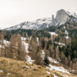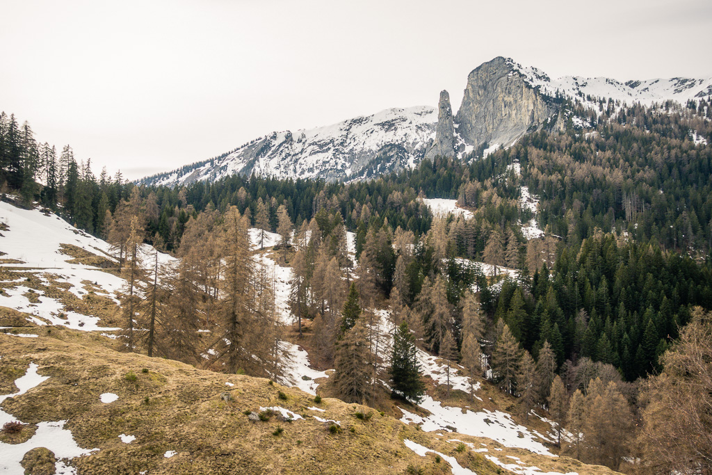 Auf der Südseite begann dann die steile und holprige Abfahrt nach Tamins. Sehr beeindruckend wieder die dunklen Felsgalerien und der ständige Blick auf den Sennenstein und den bizarren Felsturm vom Säsagit. Die Strecke war besonders im oberen Drittel von Felsblöcken und Steinen als Folge der winterlichen Lawinen und Steinschläge übersät. Weiter unten wurde dies besser und Tamins war dann nicht mehr weit weg.