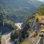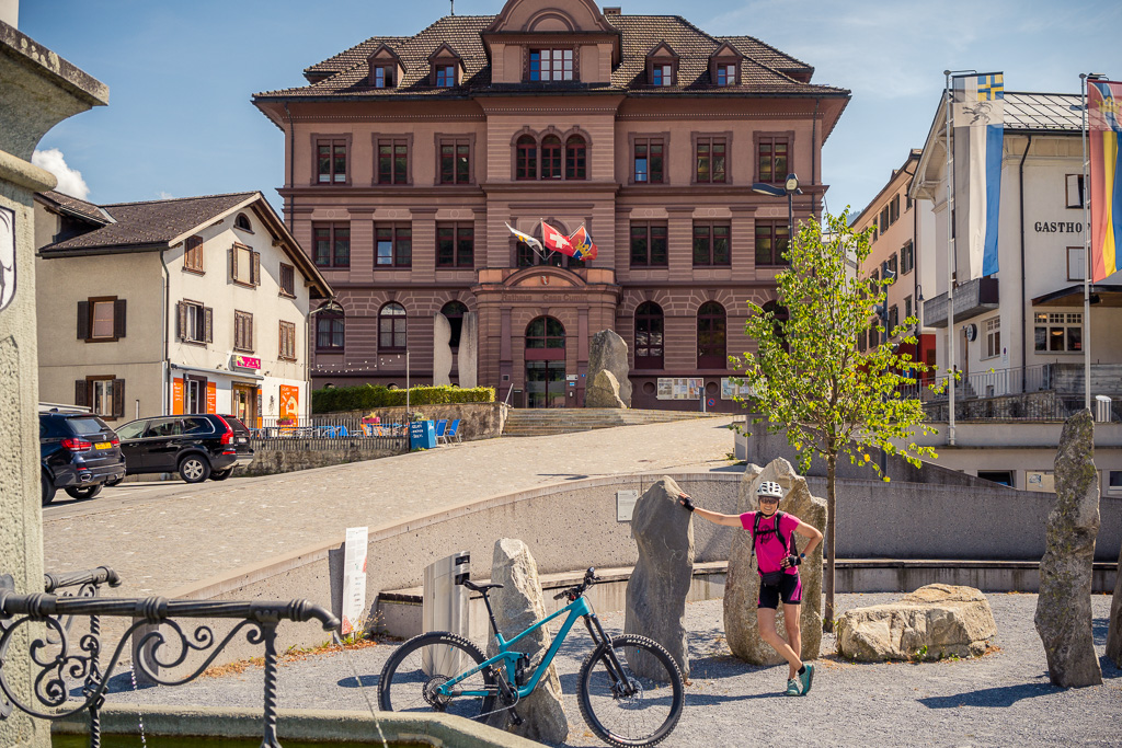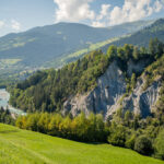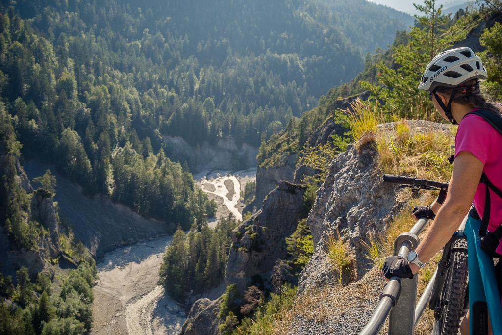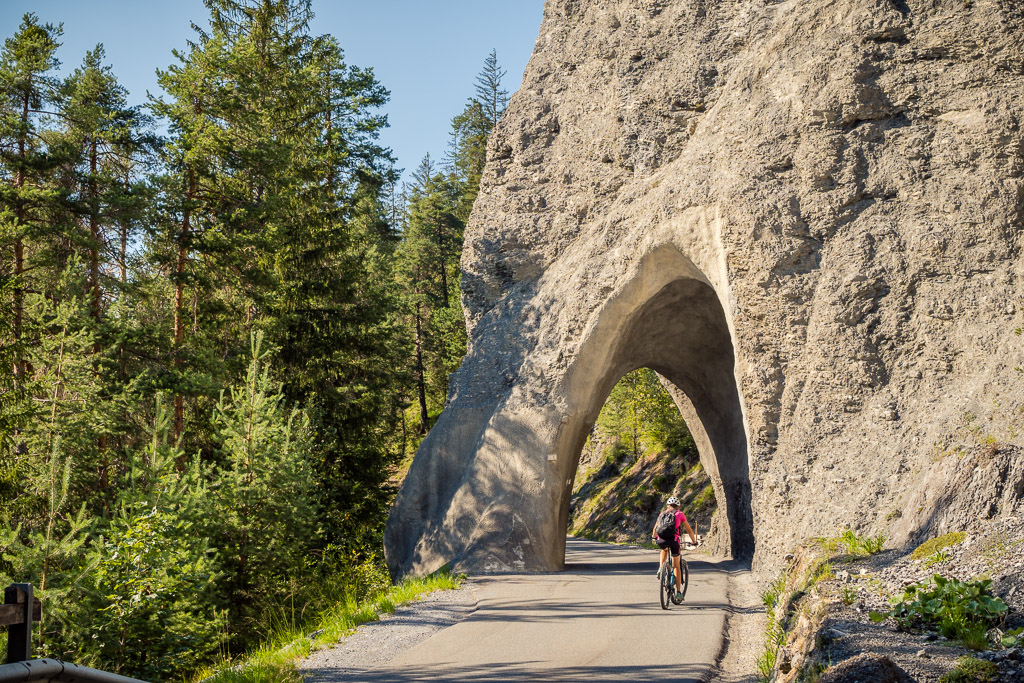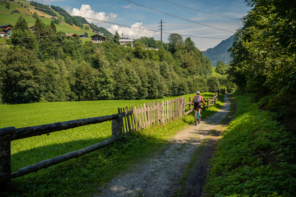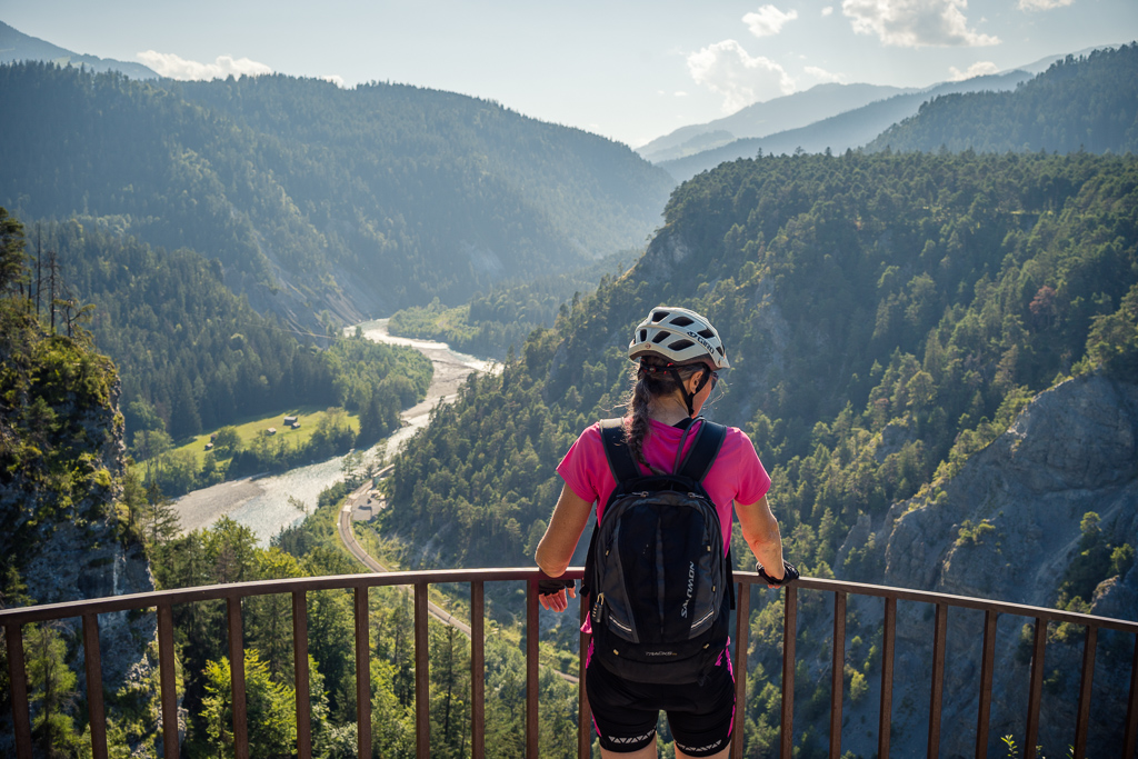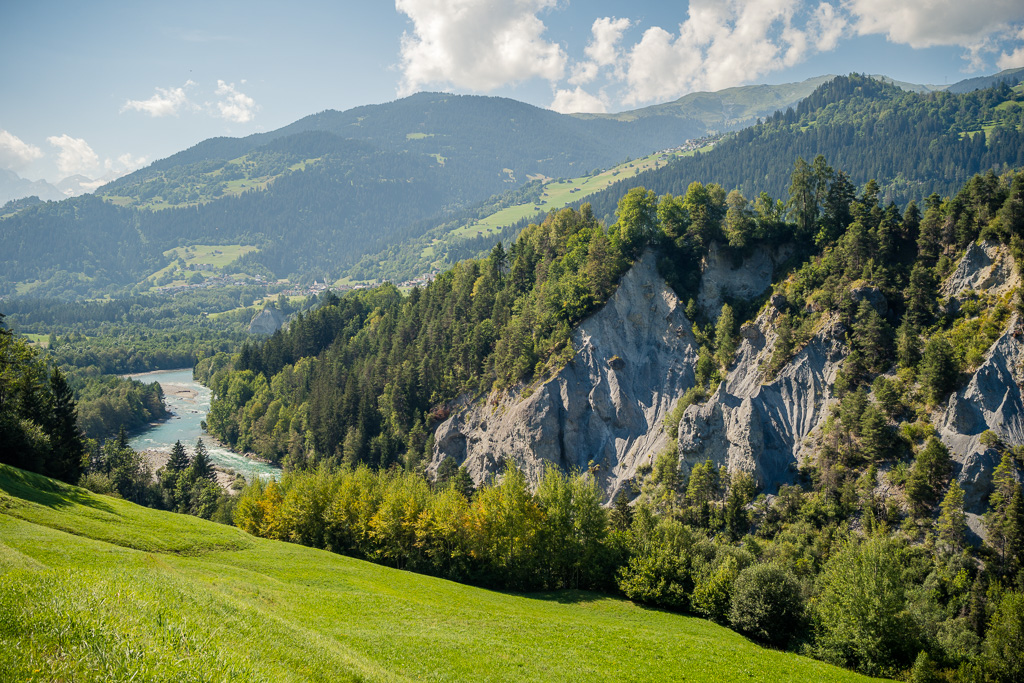 Die Fahrt talauswärts in Richtung Chur ist zumeist sehr entspannt mit Ausnahme von 2-3 kurzen Steilstücken zwischen Disentis und Trun. Nach Trun verläuft die Strecke aber gleichmässig und überwiegend am Waldrand entlang bis Ilanz. Danach beginnt ein langgezogener und gemässigter Aufstieg auf der Versamerstrasse nach Versam, gefolgt von einer kurzen Abfahrt in mehreren Haarnadelkurven durchs Versamer Tobel. Auf der Gegenseite verengt sich die Strasse mit vielen eindrücklichen Tiefblicken in die Rheinschlucht. Von diesen bekommt man in dieser Richtung auf der rechten Strassenseite allerdings nicht viel mit. Bevor es aber wieder nach Bonaduz hinuntergeht, kann man die Aussicht auf den Vorderrhein und auf die gegenüberliegende Seite der Rheinschlucht bei Flims/Laax auf einer kleinen Plattform noch in Ruhe geniessen.