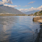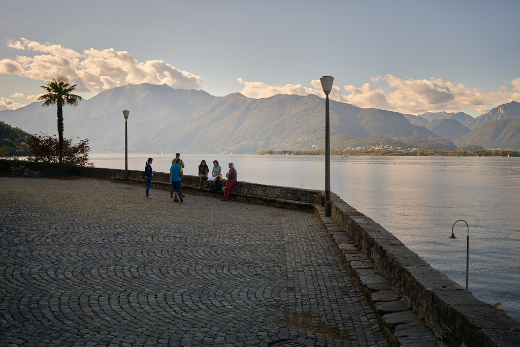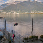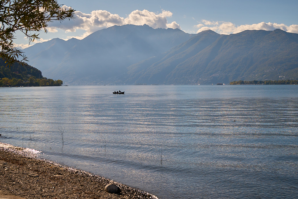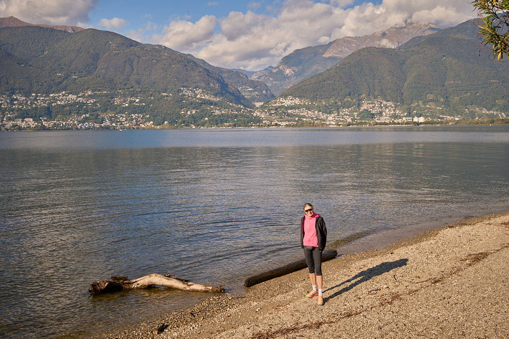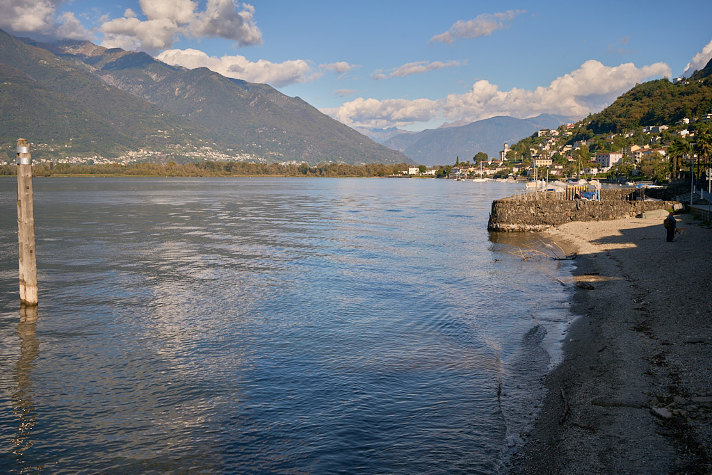 Von hier aus fuhren wir erneut nach Vira. Diesmal allerdings vom Drang getrieben, einmal richtig am Ufer des Lago Maggiore zu stehen. Durch einige Seitengassen abseits der Hauptstrasse erreichten wir dann auch die Uferpromenade, die Schiffanlegestelle für die Fährverbindung nach Locarno und einen kleinen Sandstrand daneben. Die Sonne stand schon tief, das Wasser des Lago Maggiore glitzerte – alle Zutaten für südländische Abendstimmung waren somit gegeben.
