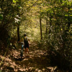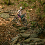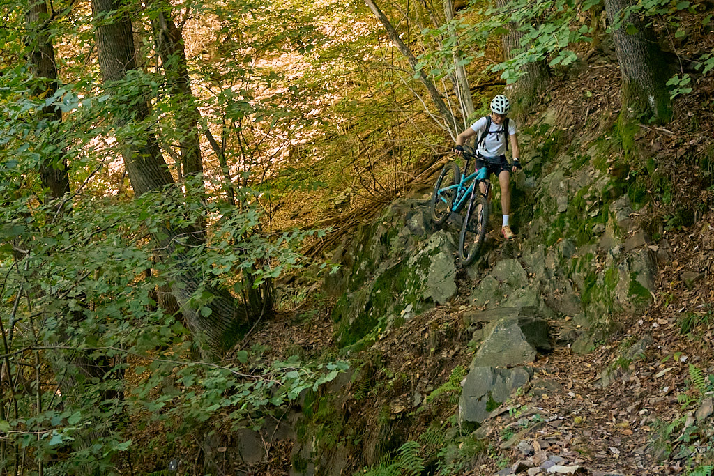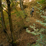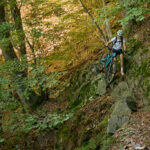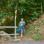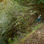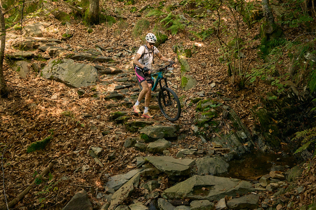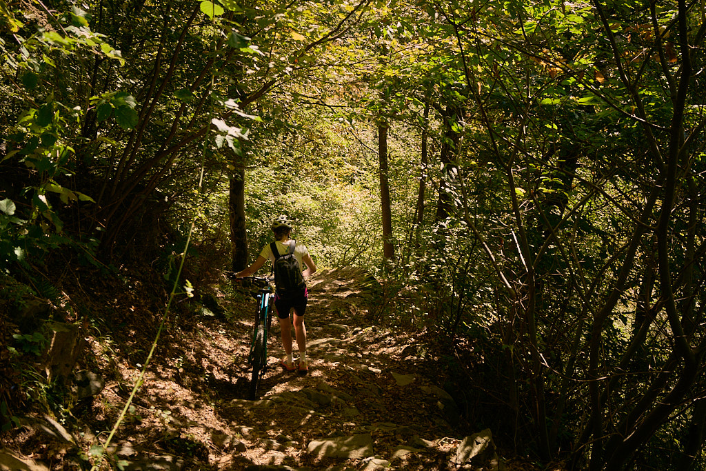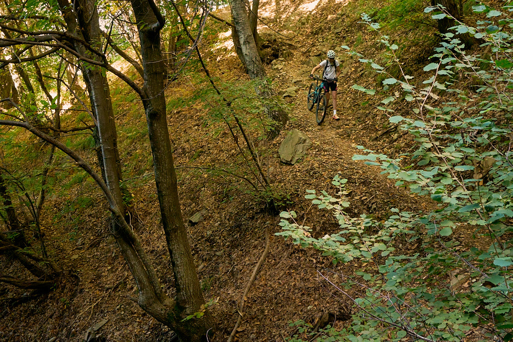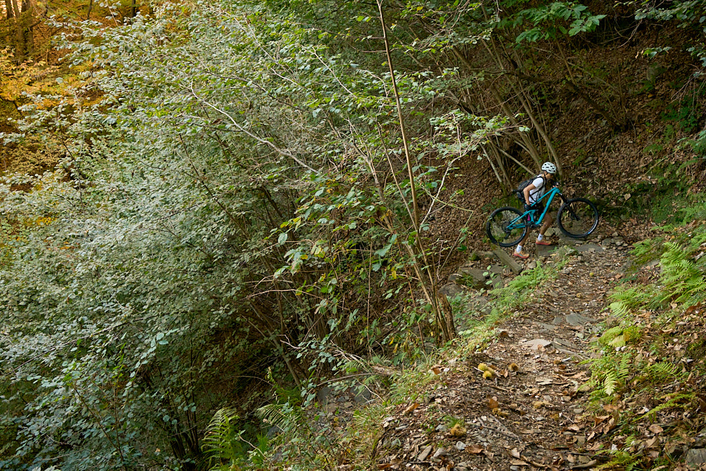 Auf einem äusserst holprigen Pfad mussten wir nun das tief eingeschnittene Valle di Cedullo durchqueren. Dies war ohne Zweifel der anstrengendste Teil des Tages. Praktisch nichts vom Weg war (für uns) fahrbar. Stattdessen mussten wir die Bikes mühsam schiebend, meist tragend, über Wurzeln, Steinblöcke, steile Stufen hinunter und ebensolche wieder hinauf befördern. Die meiste Zeit fiel der Hang unmittelbar am Wegrand steil ab, also besser nicht stolpern und nichts loslassen.