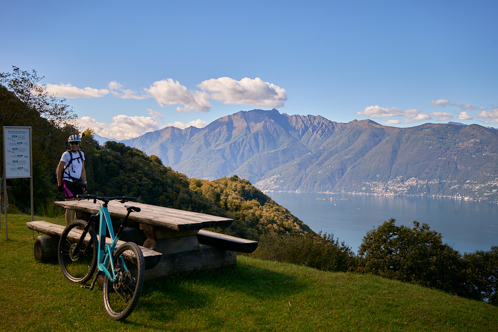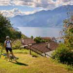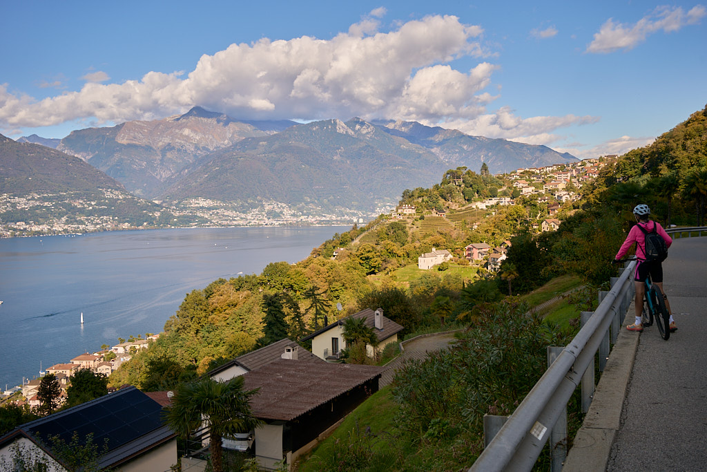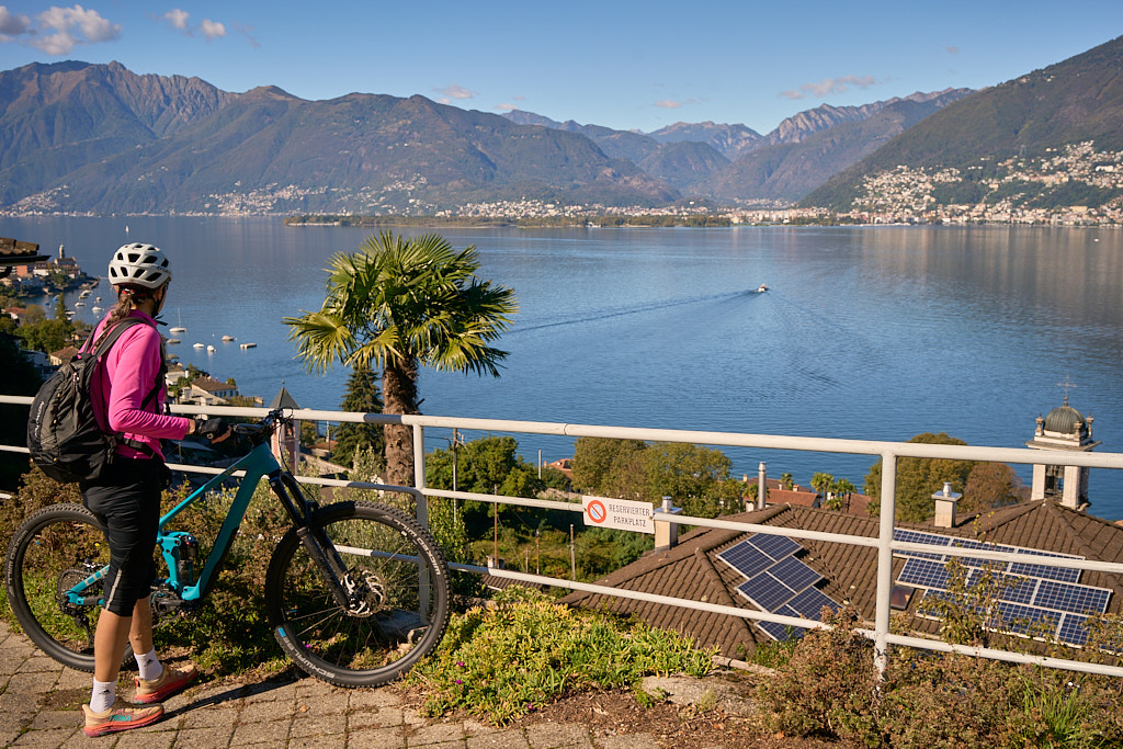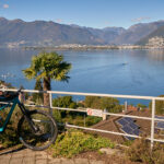 Nachdem wir von Contra aus die Flussebene von Magadino am Flugplatz Locarno vorbei auf Radwegen überquert hatten – wie üblich mit einigen für uns Landeier aufregenden Abbiegemanövern im dichten Autoverkehr auf Kreuzungen unterwegs – erreichten wir in Quartino den Anfang unserer „Rundtour”. Wir stiegen auf einer Strasse durch Weinberge auf und fuhren dem Hang entlang auf einem schönen Abschnitt durch den Wald nach Magadino und durch Wohnviertel weiter nach Vira.