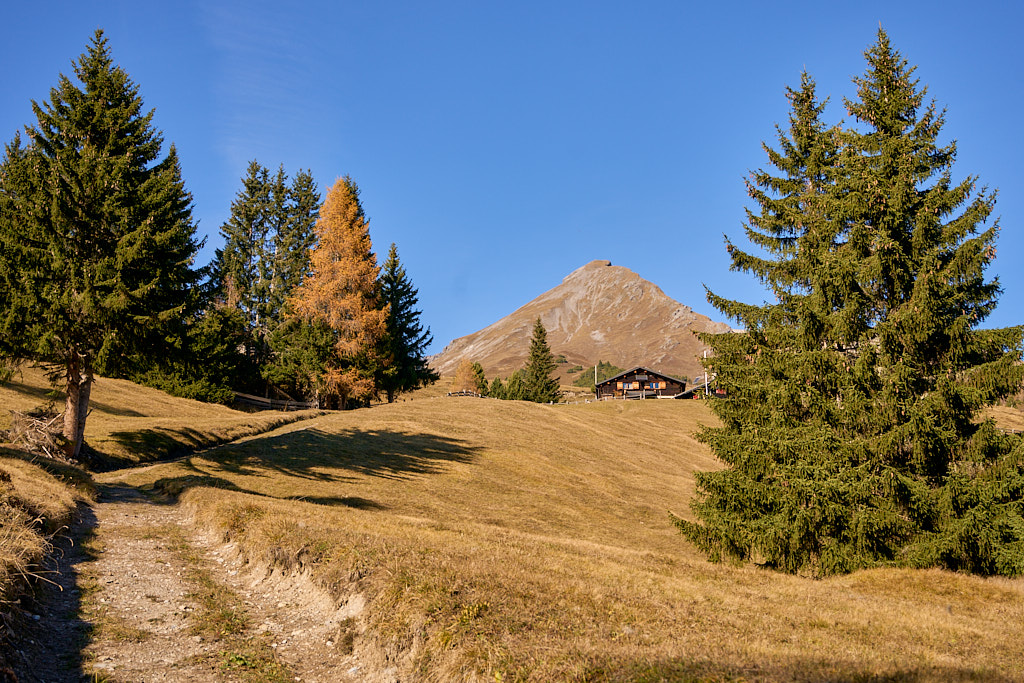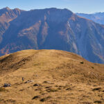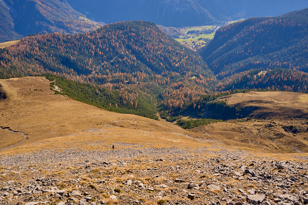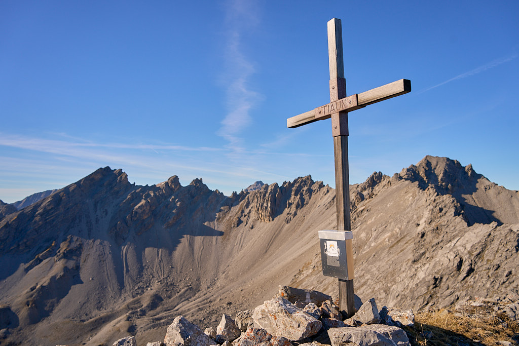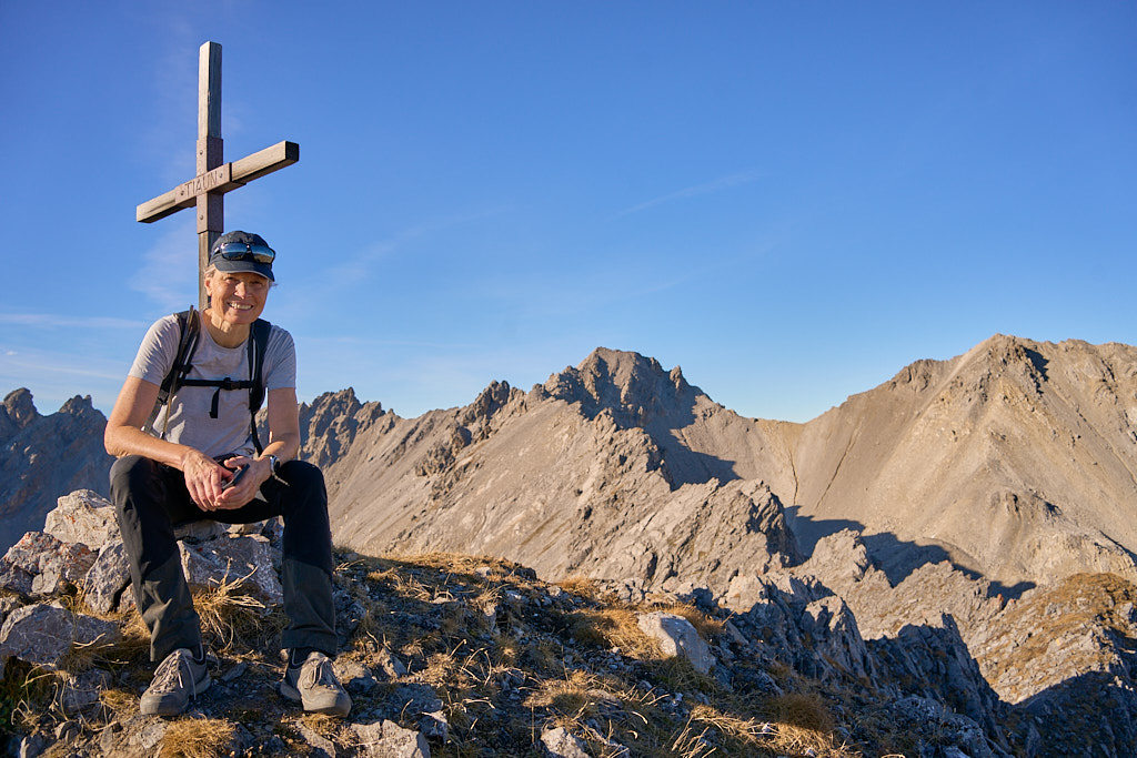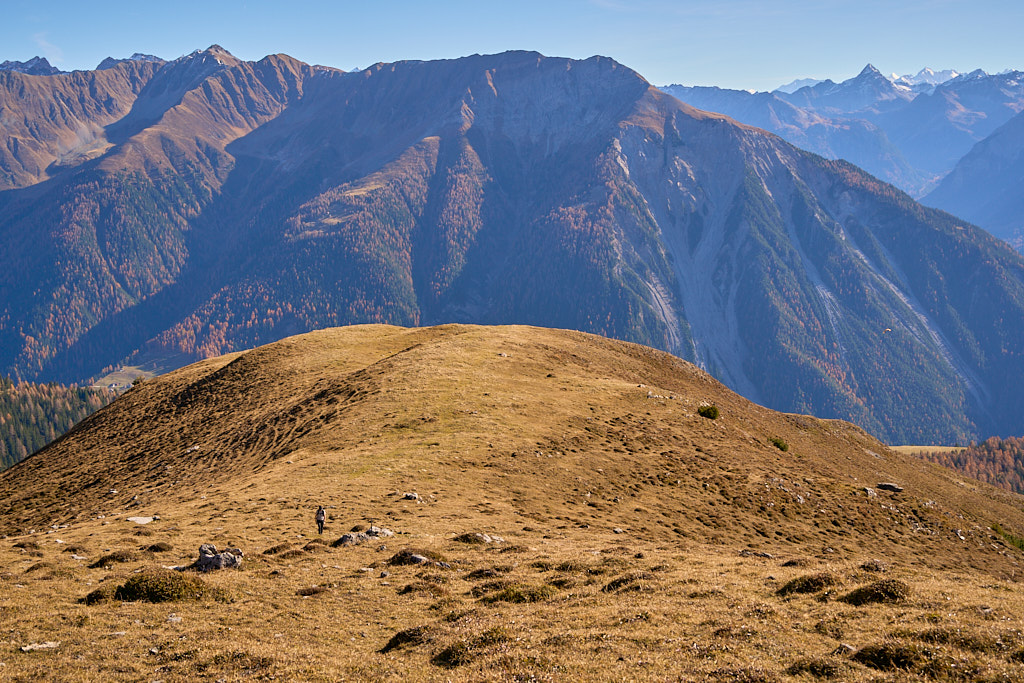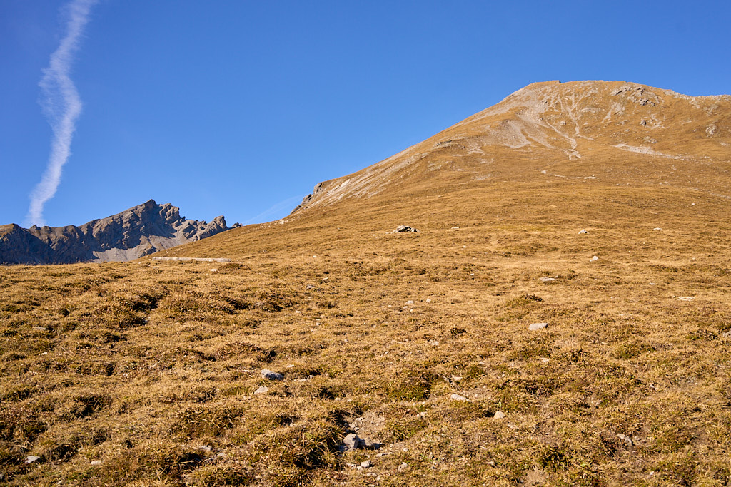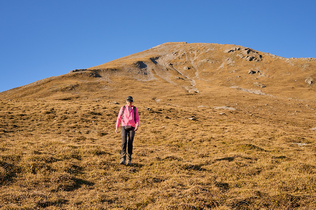 Zu Fuss kam mir die erste Aufstiegsetappe aus dem Tal auf dem «alten Pardelaweg» zur Schmittner Alp sehr lang vor, obwohl wir bis hinauf zum üblichen Bikedepot bei der Alp Afiein nur eine Viertelstunde mehr als auf dem Bike benötigten. Von hier stiegen wir querfeldein über die nach dem Ende der Alpsaison verwaisten Weidehänge weiter hoch zum Hubel, dem weiten Grasrücken unterhalb des Tiaun. Danach das übliche Spiel: der Anstieg in Richtung Gipfel wurde immer steiler, die Luft immer dünner und das daraus resultierende Tempo näherte sich demjenigen einer Schnecke. Wobei eine Schnecke wenigstens am Boden klebt, wir auf dem gerölldurchsetzten Steilgras hingegen immer wieder mal Rücksetzer hinnehmen mussten. Immerhin gab es keinen Schnee und der Boden war dank dieser langen Schönwetterperiode staubtrocken. In Gipfelnähe flachte der Hang etwas ab, es gab mehr Stufen im Gras und wir erreichten das Gipfelkreuz endlich in knapp mehr als zweieinhalb Stunden vom Haus aus.