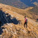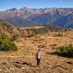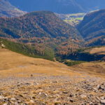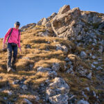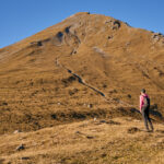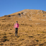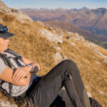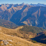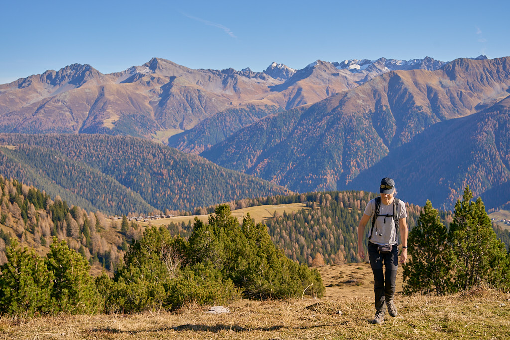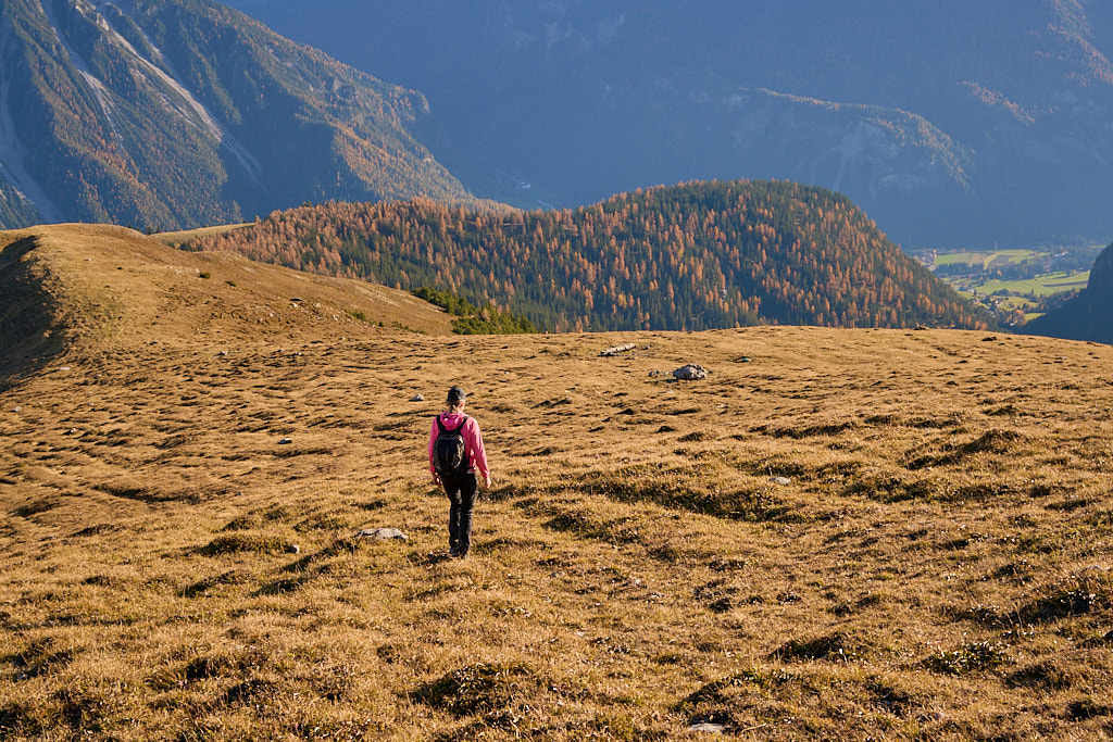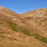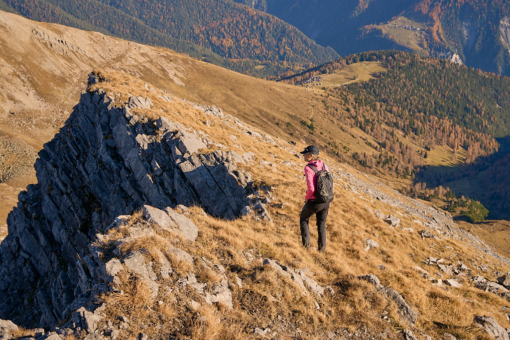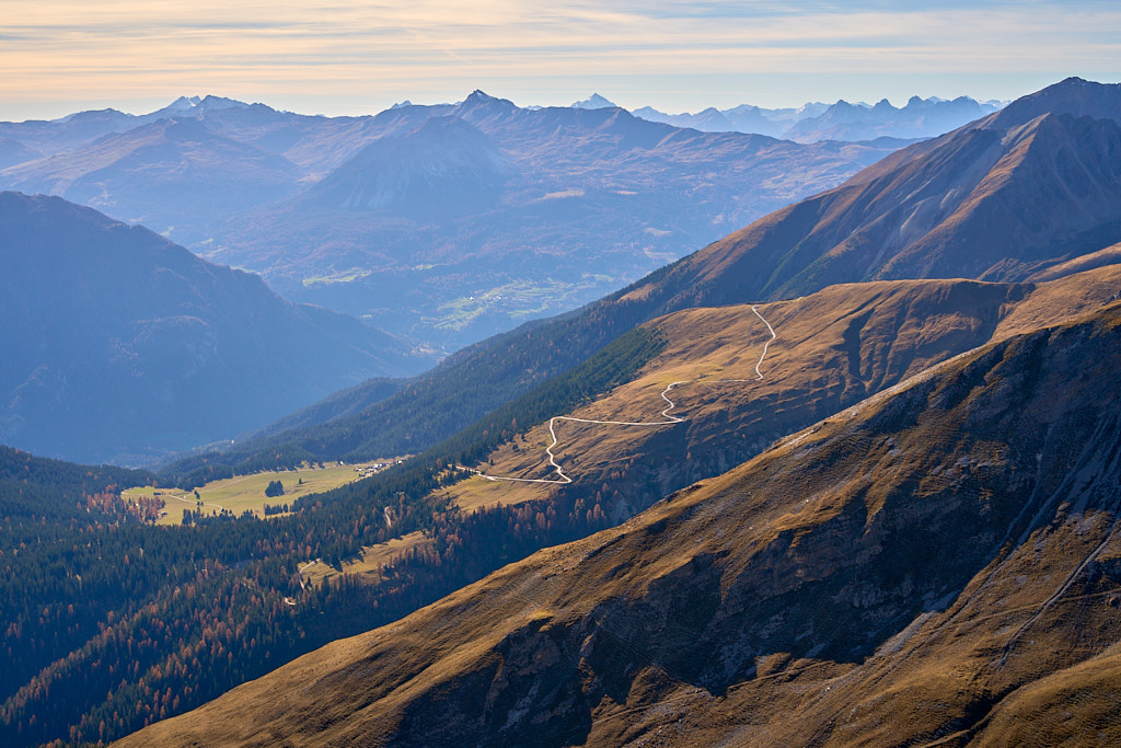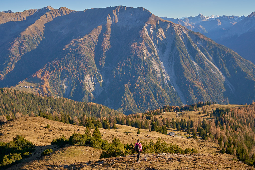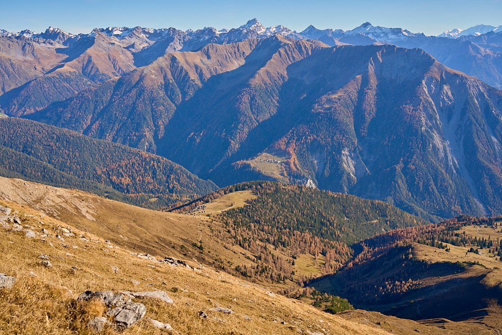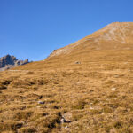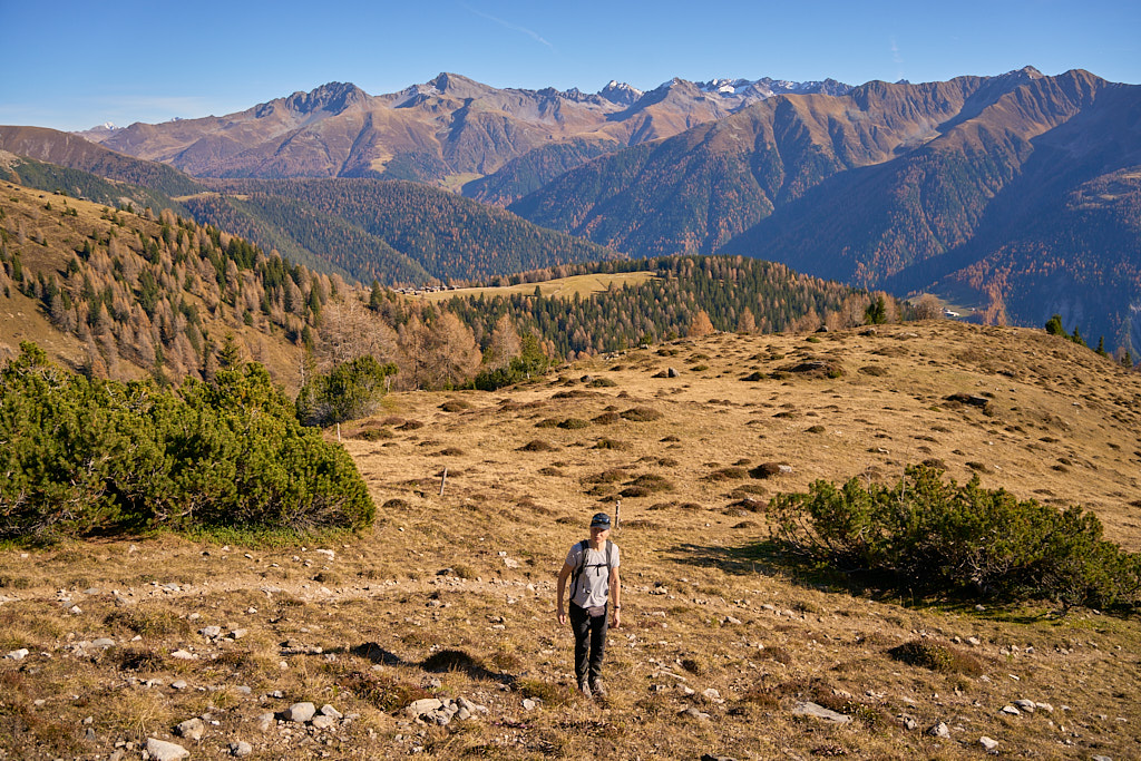 Zu Fuss kam mir die erste Aufstiegsetappe aus dem Tal auf dem «alten Pardelaweg» zur Schmittner Alp sehr lang vor, obwohl wir bis hinauf zum üblichen Bikedepot bei der Alp Afiein nur eine Viertelstunde mehr als auf dem Bike benötigten. Von hier stiegen wir querfeldein über die nach dem Ende der Alpsaison verwaisten Weidehänge weiter hoch zum Hubel, dem weiten Grasrücken unterhalb des Tiaun. Danach das übliche Spiel: der Anstieg in Richtung Gipfel wurde immer steiler, die Luft immer dünner und das daraus resultierende Tempo näherte sich demjenigen einer Schnecke. Wobei eine Schnecke wenigstens am Boden klebt, wir auf dem gerölldurchsetzten Steilgras hingegen immer wieder mal Rücksetzer hinnehmen mussten. Immerhin gab es keinen Schnee und der Boden war dank dieser langen Schönwetterperiode staubtrocken. In Gipfelnähe flachte der Hang etwas ab, es gab mehr Stufen im Gras und wir erreichten das Gipfelkreuz endlich in knapp mehr als zweieinhalb Stunden vom Haus aus.