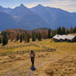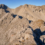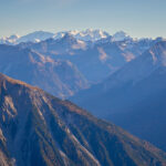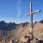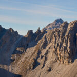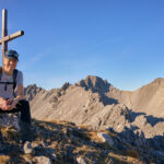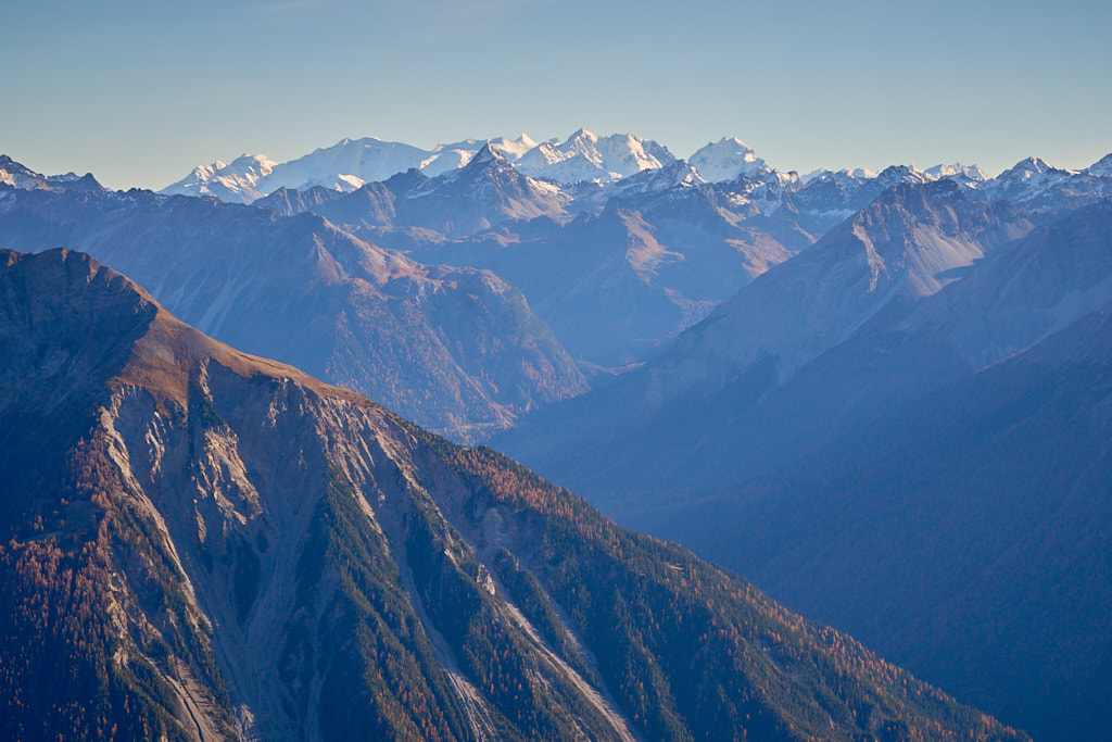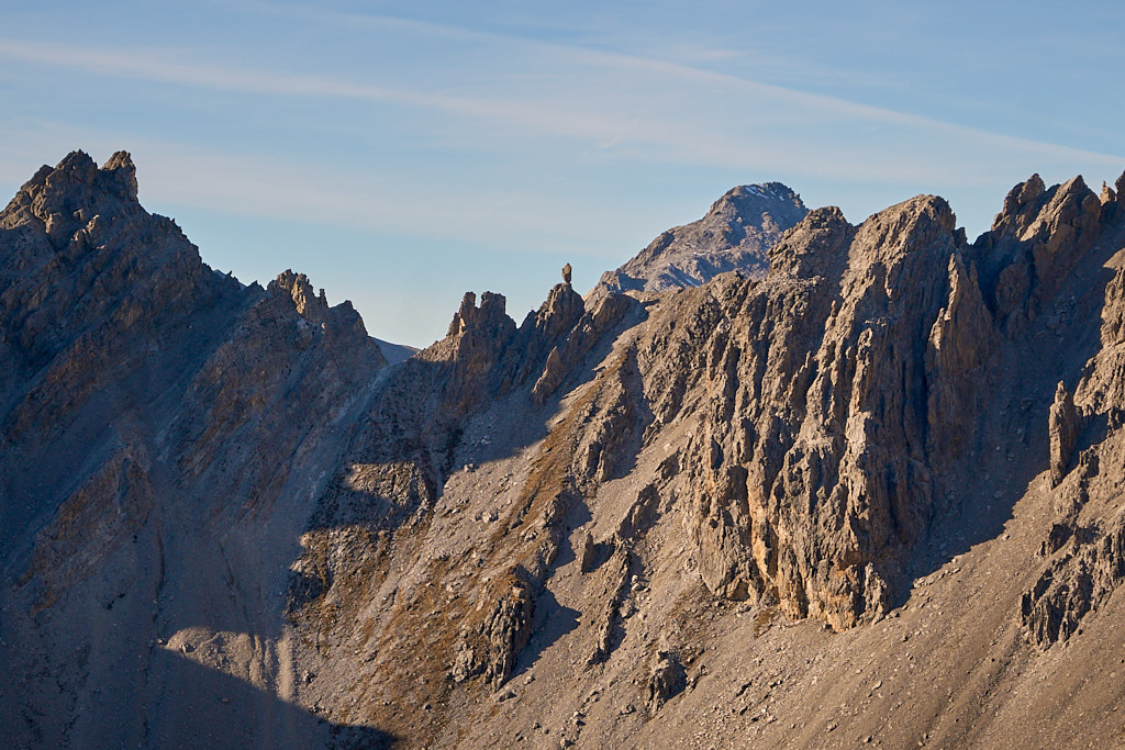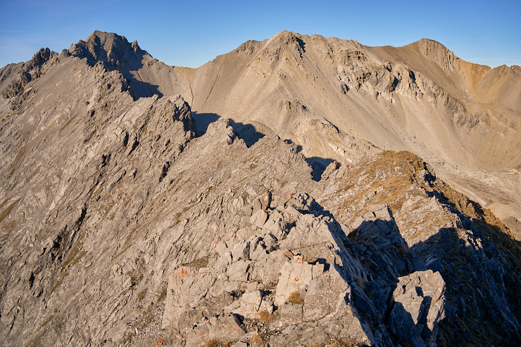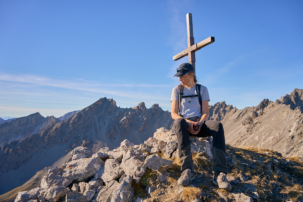 Die herbstlich klare Luft eröffnete uns vom Gipfel aus eine herrliche Fernsicht in alle Richtungen mit schönem Wechsel zwischen Licht und Schatten in der tiefen Nachmittagssonne. Beim Blick auf den Guggernellgrat fiel mir auf, dass zwischen den bizarren Felsen von Wib und Maa auf dem Grat nun ein Gipfelkreuz stand, an das ich mich vom letzten Drohnenflug her nicht erinnern kann.