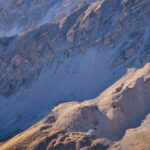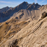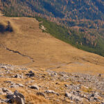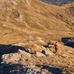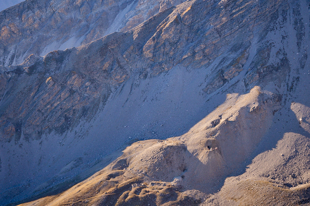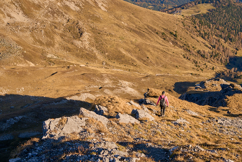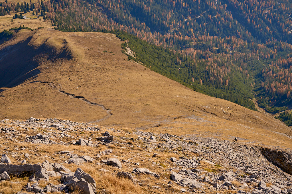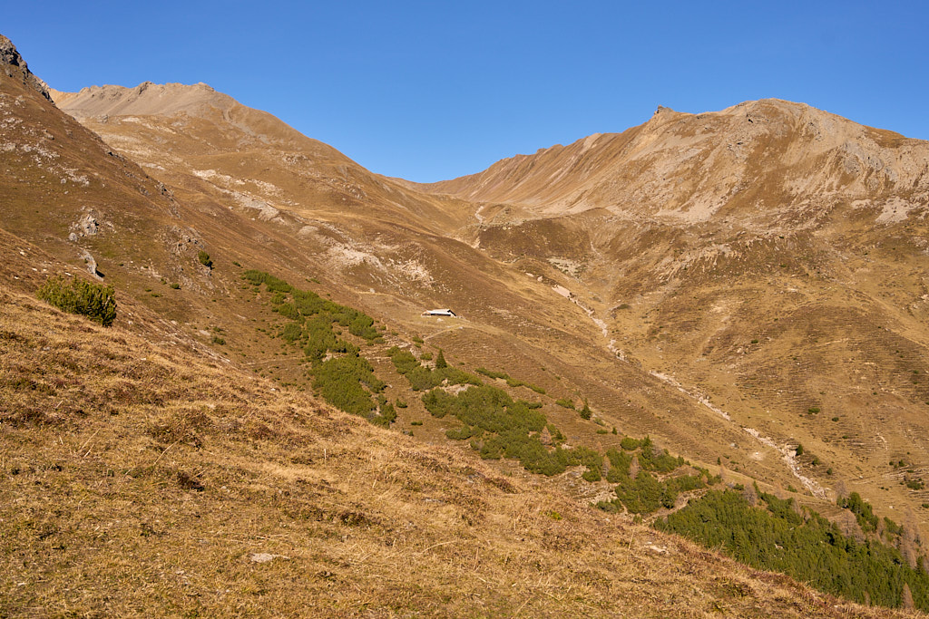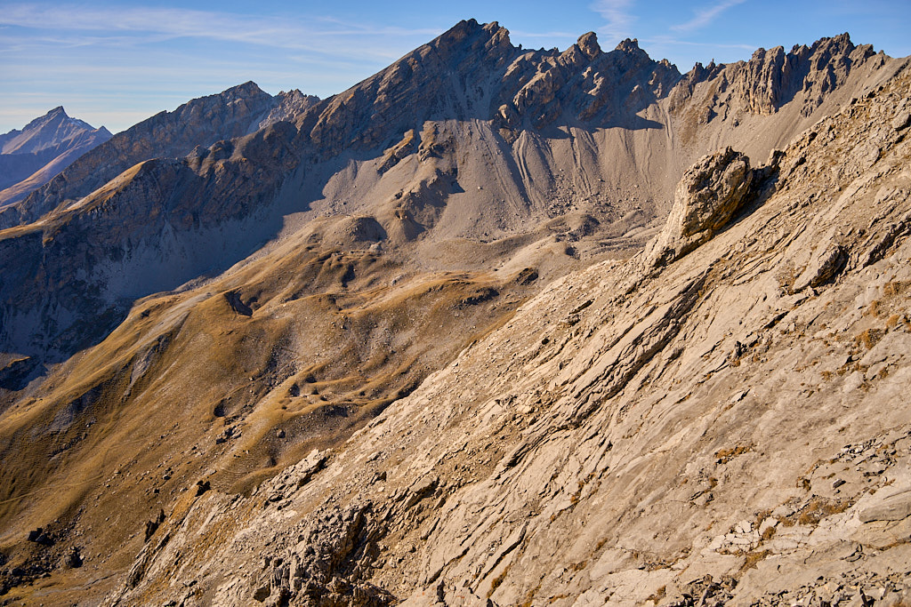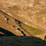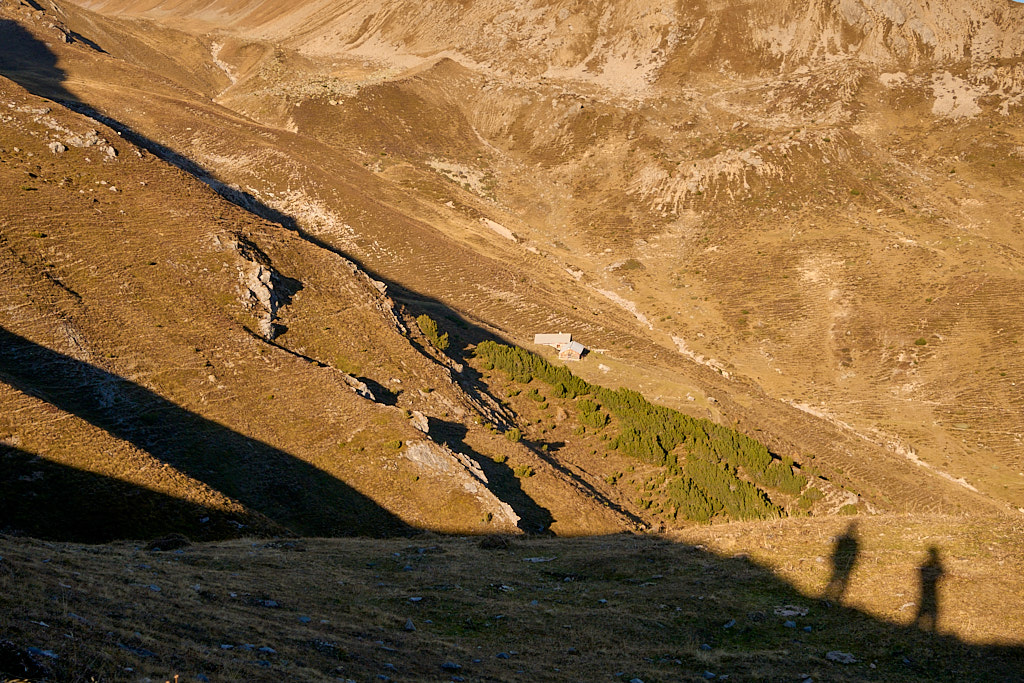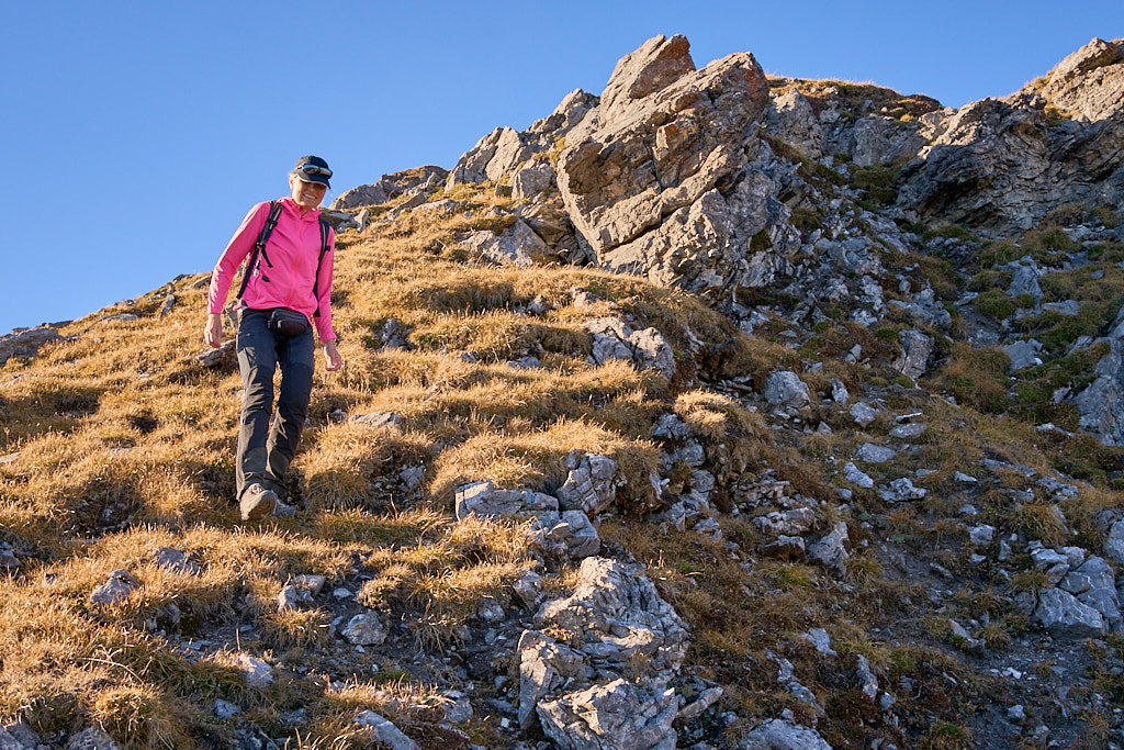 Nach einer Pause in der noch angenehm lauwarmen Sonne machten wir uns wieder auf den Abstieg, diesmal über die Ostseite entlang der scharfen Kante zwischen dem Grashang und den senkrechten Felsabbrüchen zur Alp Martrüel hin. Da diese schon längst im Schatten lag, hielten wir im unteren Teil dann wieder auf den Hubel zu und stiegen den Rest ins Tal auf dem Hinweg ab.