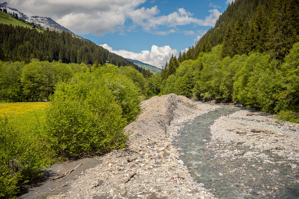 Nach einer wunderschönen und dank leichtem Gefälle zügigen Fahrt über den Schluchtweg öffnete sich das Gelände gegen den Talausgang allmählich. Der Trail verbreiterte sich zuerst zu einem Feldweg, später zu einer Alpstrasse. Die ersten Hütten und Autos tauchten auf und die Abfahrt um das nördliche Ende des Heinzenbergs herum hinunter nach Bonaduz begann. Noch vor dem Ortseingang von Bonaduz ging es über Felder an Industrieanlagen und Einfamilienhäusern vorbei nach Rhäzüns. Dort fuhr ich noch ein Stück auf der Kantonsstrasse weiter, bis ich den Hinterrhein auf einer Brücke überqueren und nach Rothenbrunnen gelangen konnte. Über Feldwege und verkehrsarme Nebenstrassen rollte ich entspannt und ziemlich erschöpft durch die verschiedenen Dörfer auf der Ostseite des Domleschg wieder nach Thusis zurück.