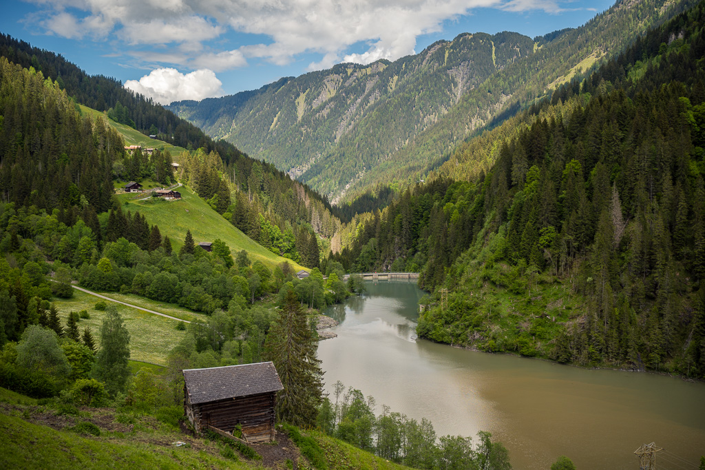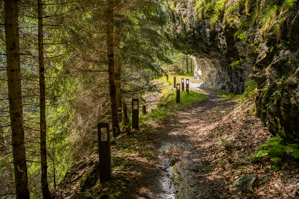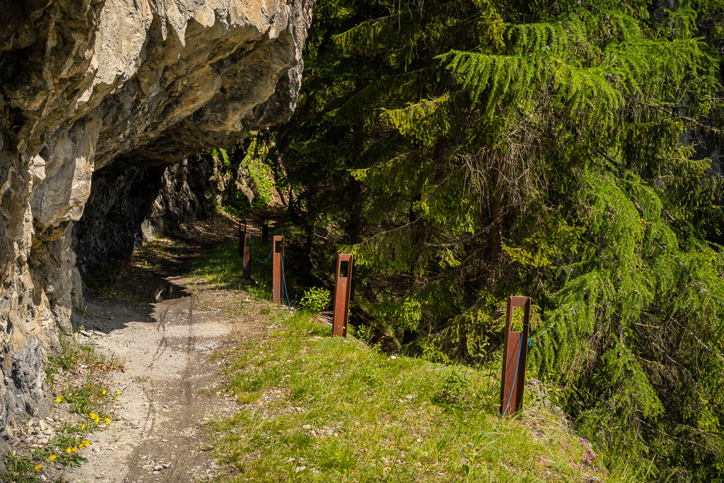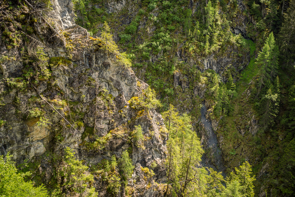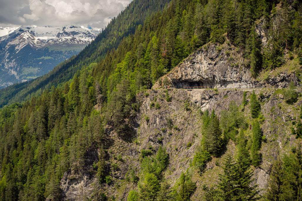 Die Rabiusa ist der Fluss, der aus dem Safiental in den Vorderrhein mündet. Anfangs folgte ich der Autostrasse von Safien Platz talauswärts, von der man bald einen kleinen Stausee im Talgrund erblicken konnte. Bei einer Abzweigung konnte ich von der Strasse auf einem Feldweg zur Staumauer des kleinen Sees und auf die andere Talseite gelangen. Hier begann nun der spektakulärste Teil der Tour: ein abenteuerlicher Höhenweg in den Hangfelsen hoch über der Rabiusa, die bald in einer immer tiefer werdenden Schlucht talauswärts floss. Der Höhenweg war vom Charakter her durchaus mit dem Schaftobel bei Filisur oder dem Schynweg nach Tiefencastel vergleichbar, im Gegensatz zu beiden aber nicht gesperrt und offiziell als Wanderweg begehbar bzw. mit mit Mountainbikes befahrbar. Die Trasse war zwar breit wie ein Saumweg, führte aber meistens hart am Abgrund entlang, querte zahlreiche rauschende Bäche auf glatten Zementplatten und verengte sich im mittleren Teil zu einem Singletrail mit einigen kurzen Schiebepassagen. Wegen des nassen Untergrunds war auch hier auf dem Gravelbike durchgehend höchste Aufmerksamkeit geboten, was dem puren Fahrvergnügen aber keinen Abbruch tat.