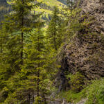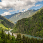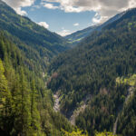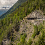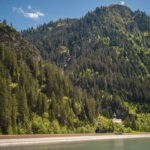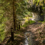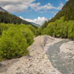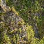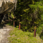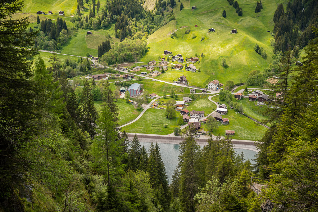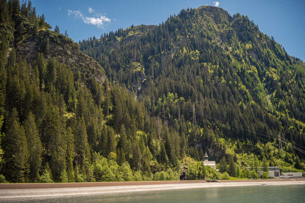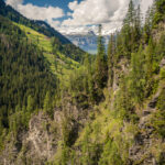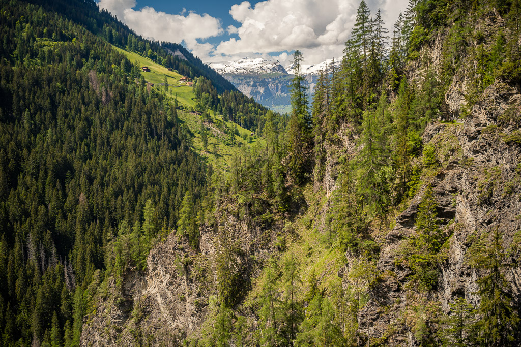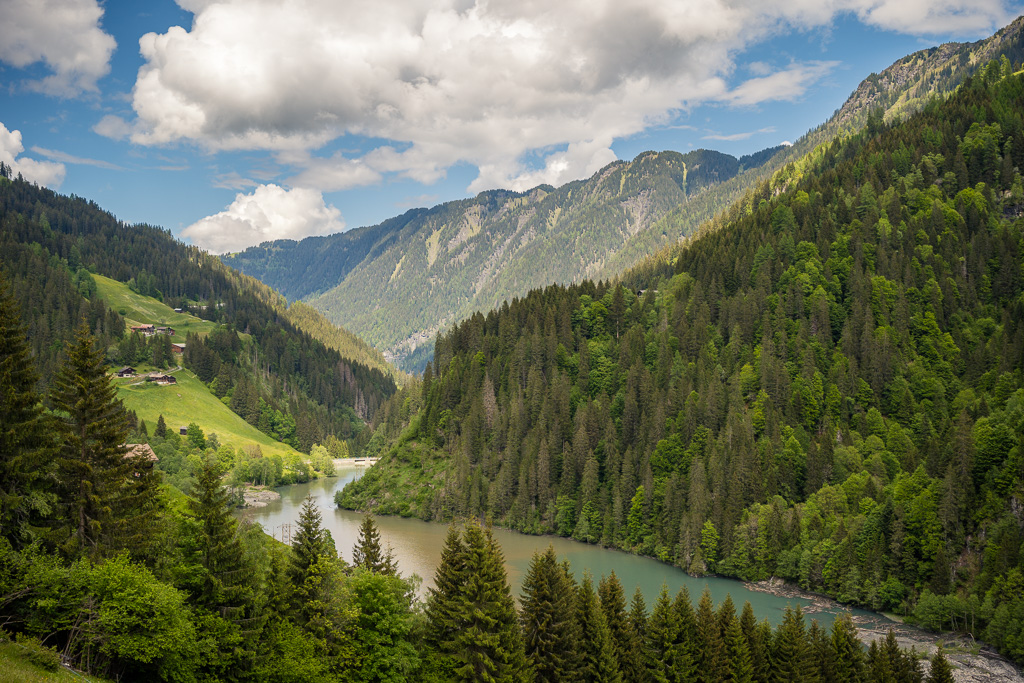 Die Rabiusa ist der Fluss, der aus dem Safiental in den Vorderrhein mündet. Anfangs folgte ich der Autostrasse von Safien Platz talauswärts, von der man bald einen kleinen Stausee im Talgrund erblicken konnte. Bei einer Abzweigung konnte ich von der Strasse auf einem Feldweg zur Staumauer des kleinen Sees und auf die andere Talseite gelangen. Hier begann nun der spektakulärste Teil der Tour: ein abenteuerlicher Höhenweg in den Hangfelsen hoch über der Rabiusa, die bald in einer immer tiefer werdenden Schlucht talauswärts floss. Der Höhenweg war vom Charakter her durchaus mit dem Schaftobel bei Filisur oder dem Schynweg nach Tiefencastel vergleichbar, im Gegensatz zu beiden aber nicht gesperrt und offiziell als Wanderweg begehbar bzw. mit mit Mountainbikes befahrbar. Die Trasse war zwar breit wie ein Saumweg, führte aber meistens hart am Abgrund entlang, querte zahlreiche rauschende Bäche auf glatten Zementplatten und verengte sich im mittleren Teil zu einem Singletrail mit einigen kurzen Schiebepassagen. Wegen des nassen Untergrunds war auch hier auf dem Gravelbike durchgehend höchste Aufmerksamkeit geboten, was dem puren Fahrvergnügen aber keinen Abbruch tat.