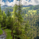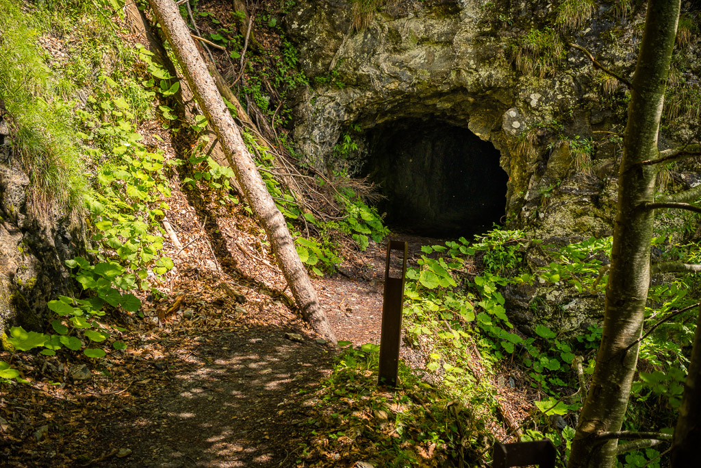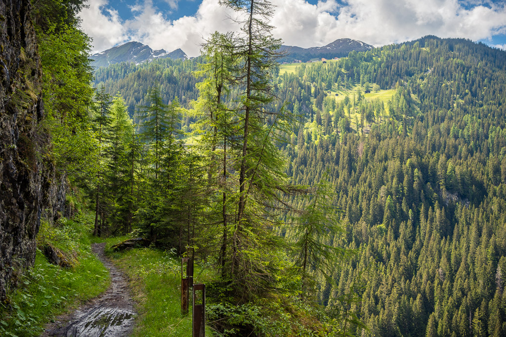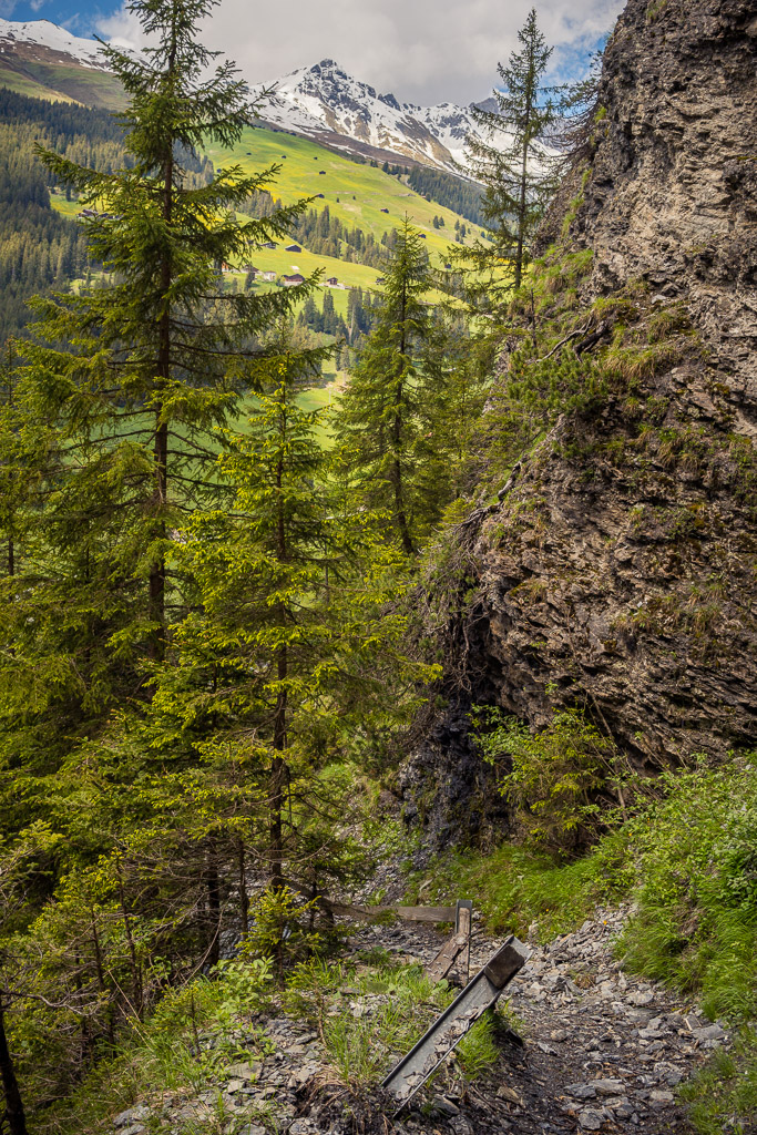 Kurze Zeit später war der Fahrweg zu Ende. Er mündete in einen holprigen Wanderweg, laut Karte ebenfalls eine Mountainbikeroute, aber zumindest heute nach mehreren Regentagen im aktuellen Zustand mit nassen Wurzeln und Steinen wohl auch für hartgesottene Mountainbiker kein wirkliches Fahrvergnügen. Über die Abfahrt musste ich mir dank Gravelbike jedenfalls nicht den Kopf zerbrechen: es war klar, dass ich die 45 Gehminuten hinunter ins Safiental zu Fuss und mit dem Bike auf der Schulter zurücklegen würde, was dank dem geringen Gewicht auch zügig und problemlos vonstatten ging.