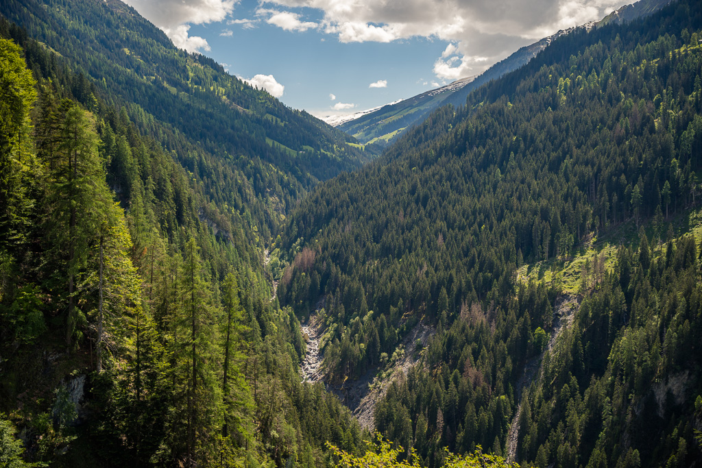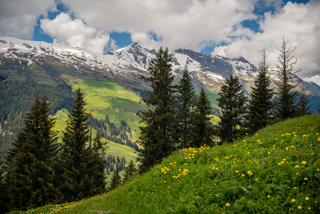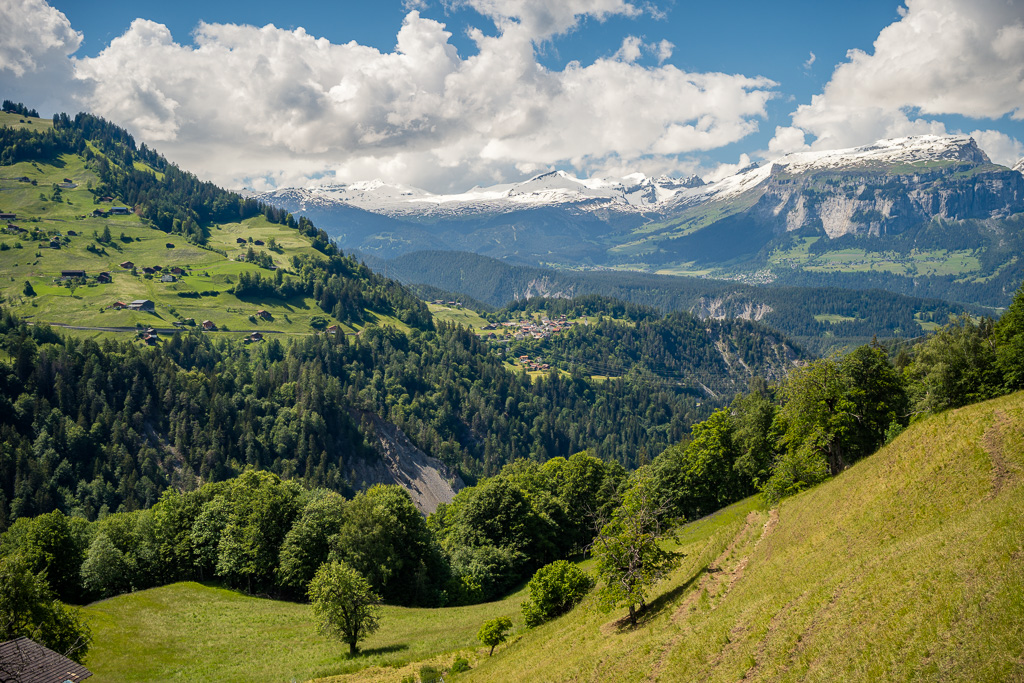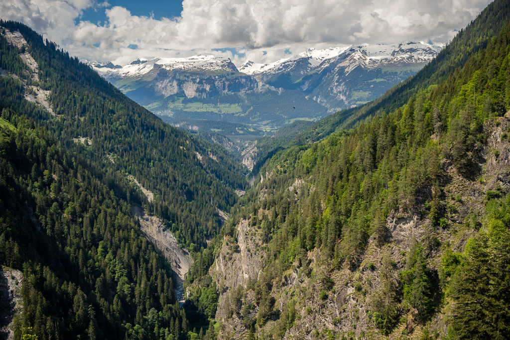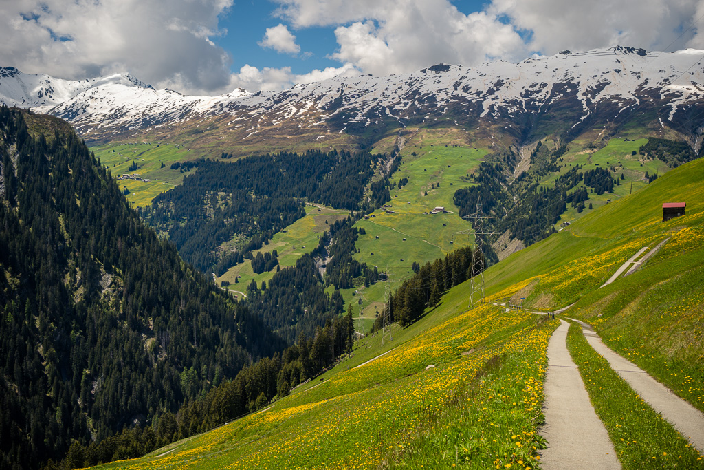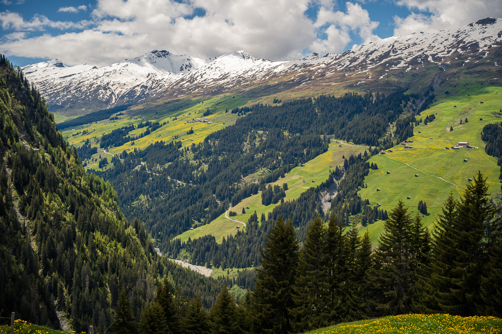 Etwas später führte der Fahrweg langsam bergab auf die andere Seite vom Glaspass und der Blick wurde erstmals frei auf die weiten Hänge vom Safiental. Das Tal mündete nach rechts (Norden) ins Vorderrheintal bei Bonaduz. Links hingegen wurden verschneite Gebirgszüge sichtbar, über die laut Karte eine weitere Mountainbikeroute über den Tomülpass bis nach Vals ins übernächste Seitental führt.