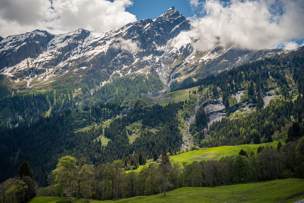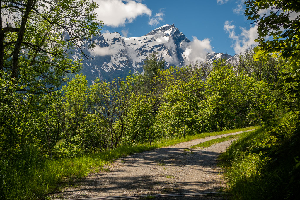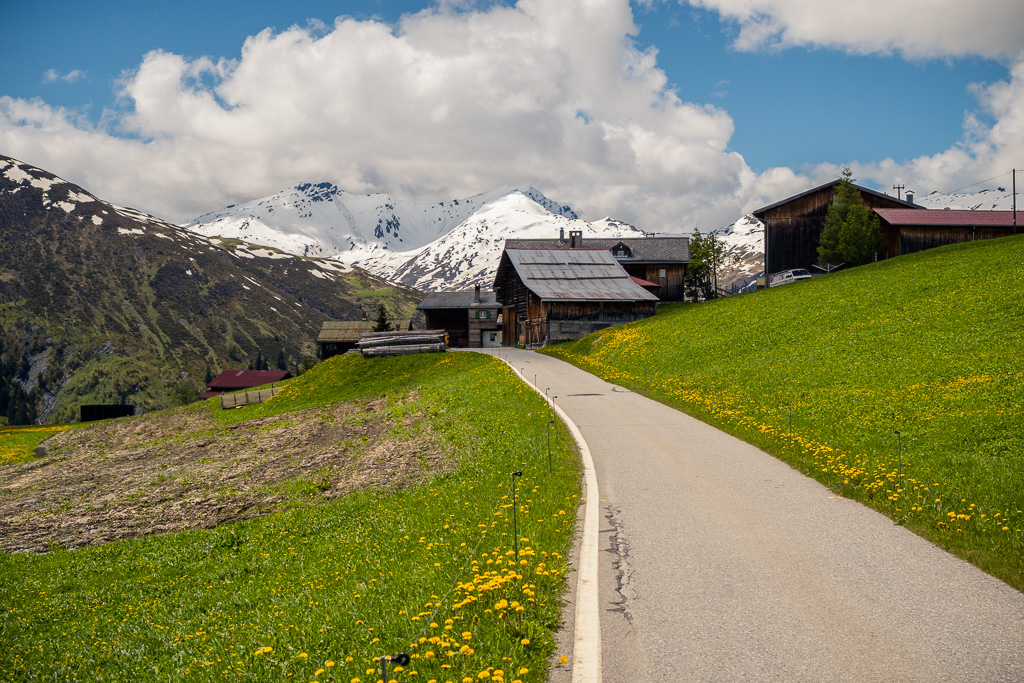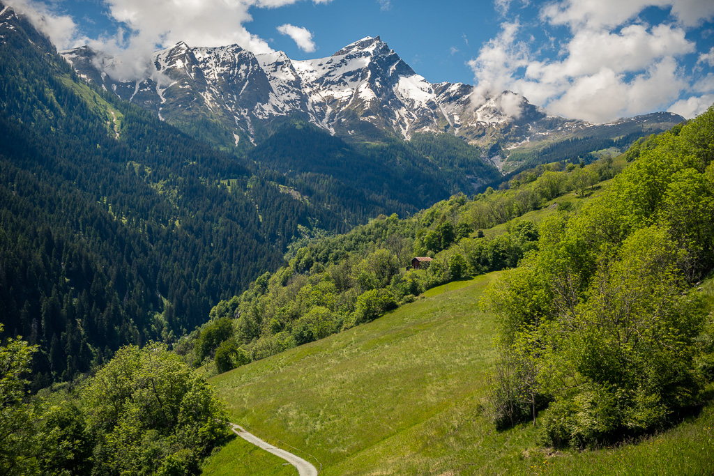 Den Aufstieg von Thusis zum Glaspass über Strassen und Fahrwege nahm ich dieses Mal mit dem Gravelbike in Angriff. Im Vergleich zum Mountainbike ging es damit spürbar schneller und leichter voran, auch wenn die Steigung – wie für viele der «kleinen» Alpen-Passübergänge typisch – sich stets an der Grenze von «angenehm steil» zu «ausser Atem kommend steil» bewegte. Während des ganzen Aufstiegs konnte ich immerhin ständig den imposanten Ausblick auf den noch tief verschneiten Piz Beverin geniessen.