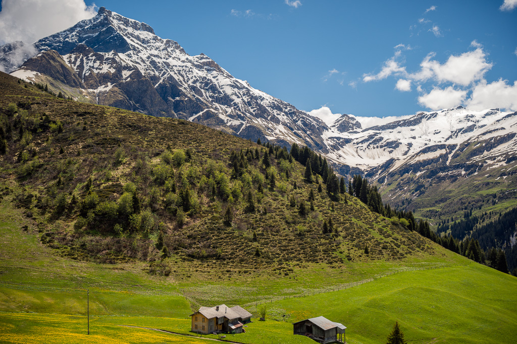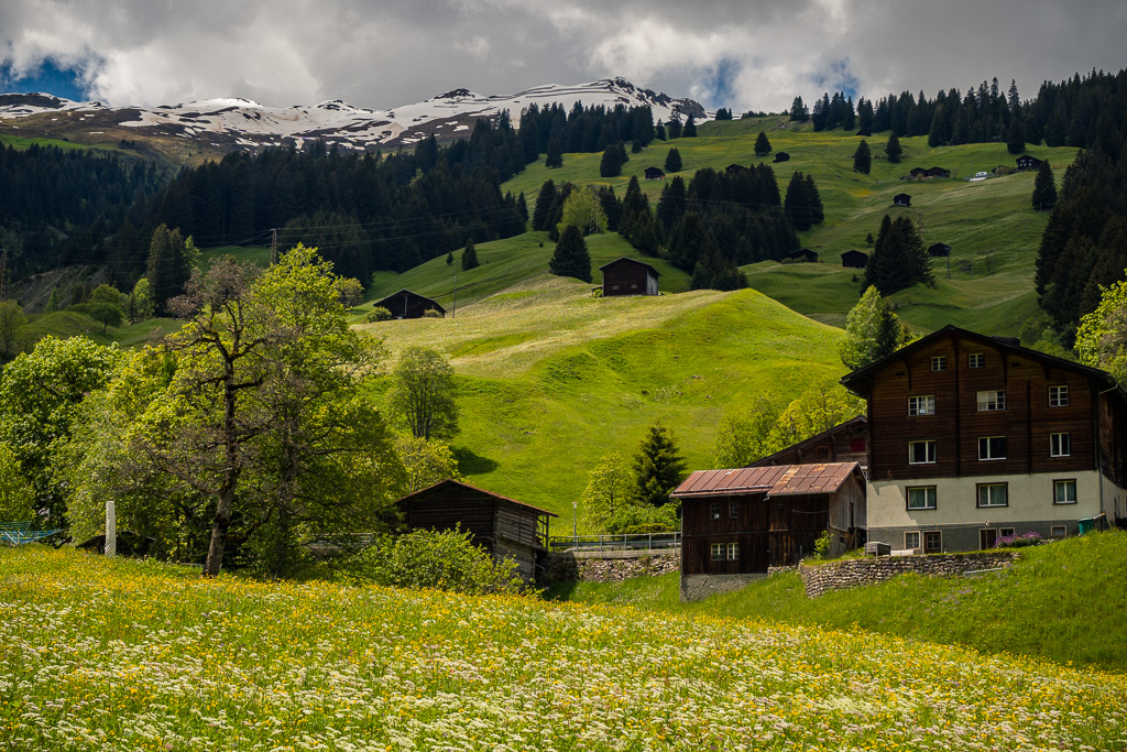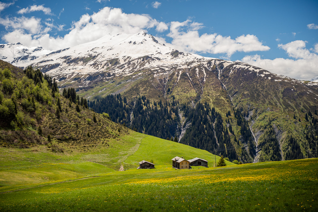 Auf dem Glaspass selber: ein Autoparkplatz, eine Bushaltestelle, ein Restaurant und ein paar verstreute Bauernhöfe. Alles vor der Kulisse des nun zum Greifen nah scheinenden Piz Beverin.