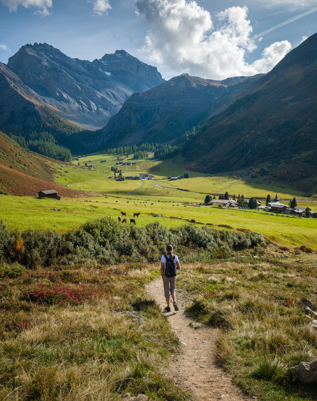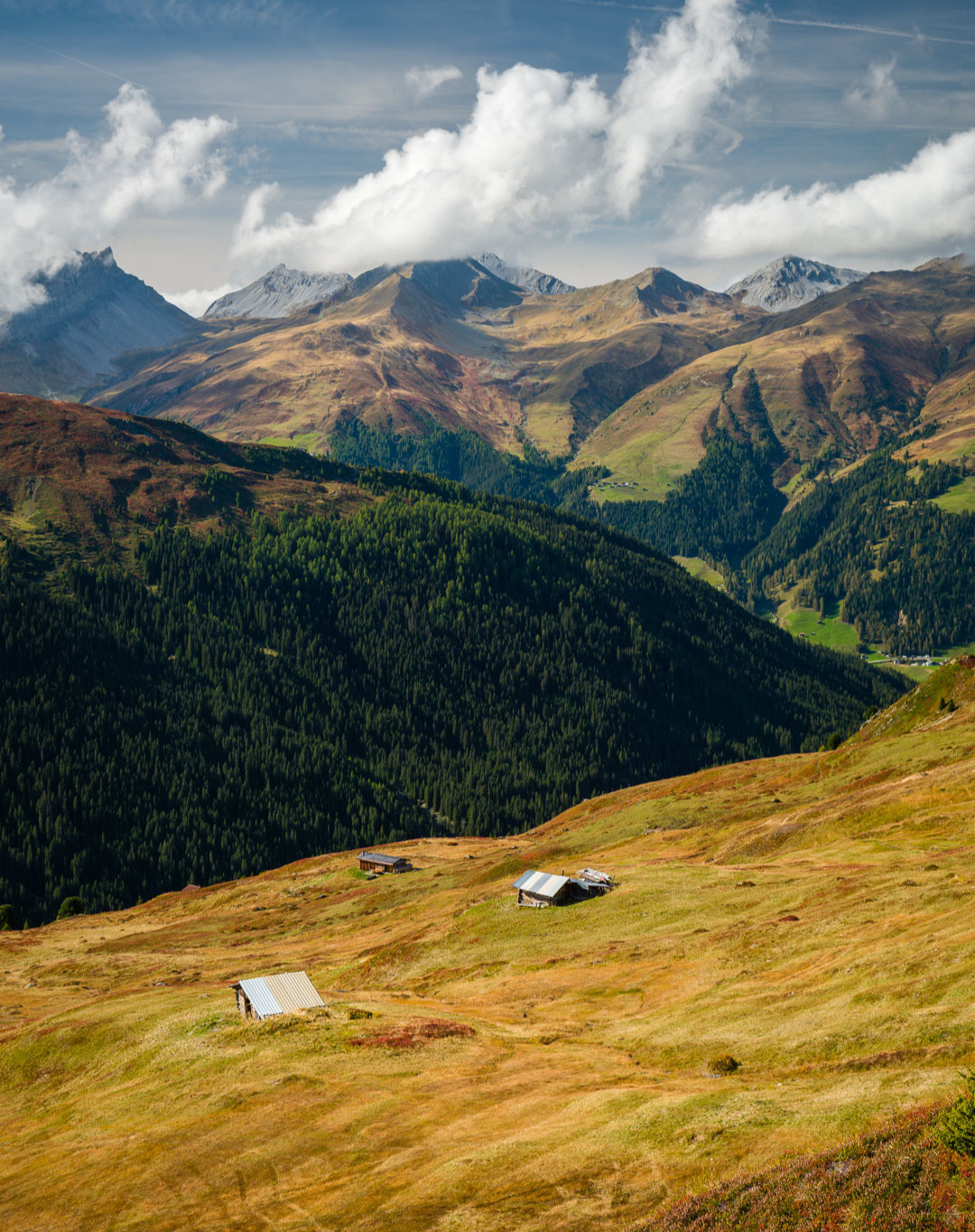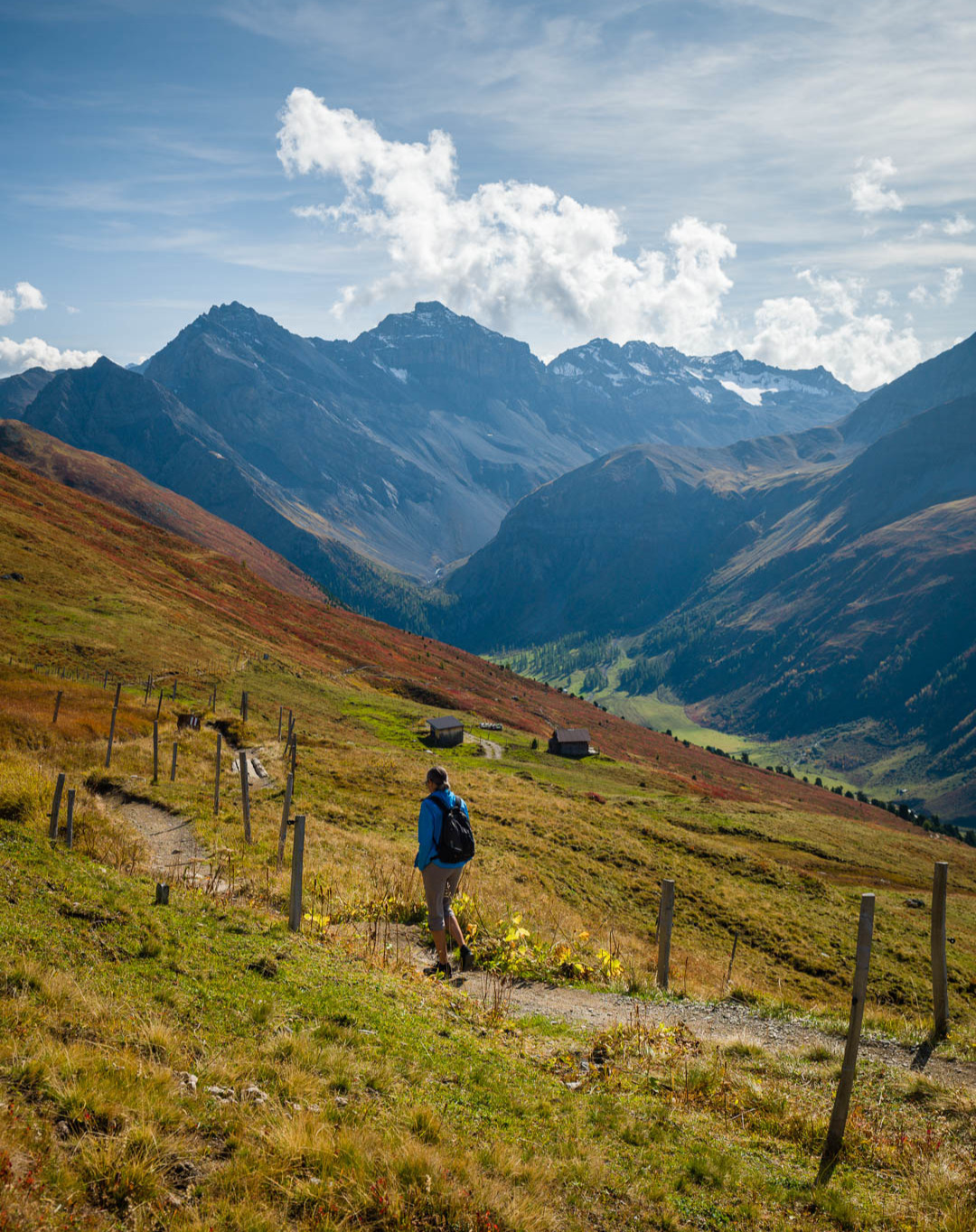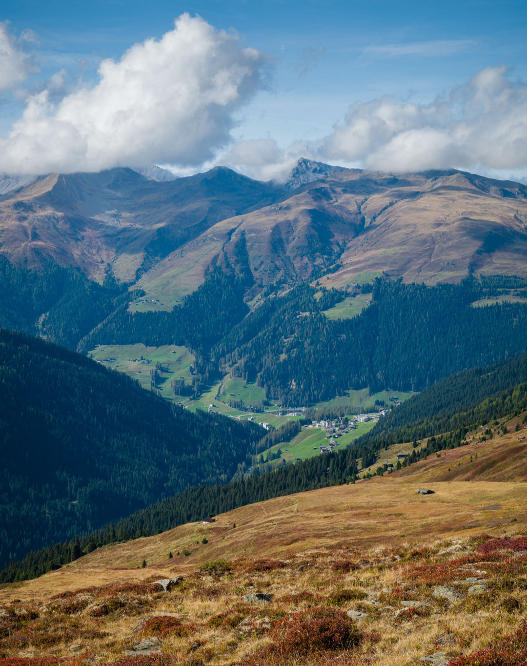 Wanderung vom Jakobshorngipfel ins Sertigtal inmitten einer farbenprächtigen Herbstlandschaft.