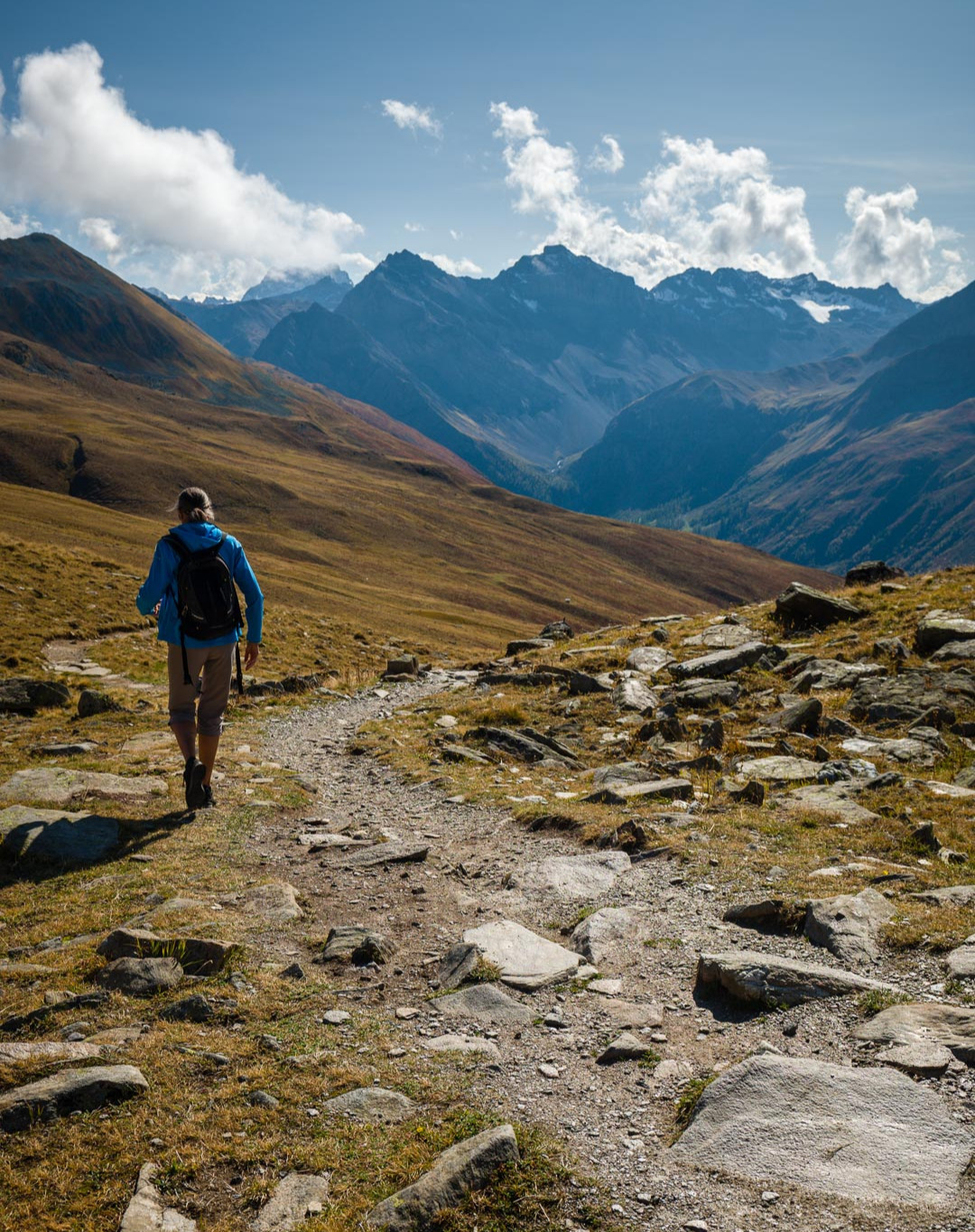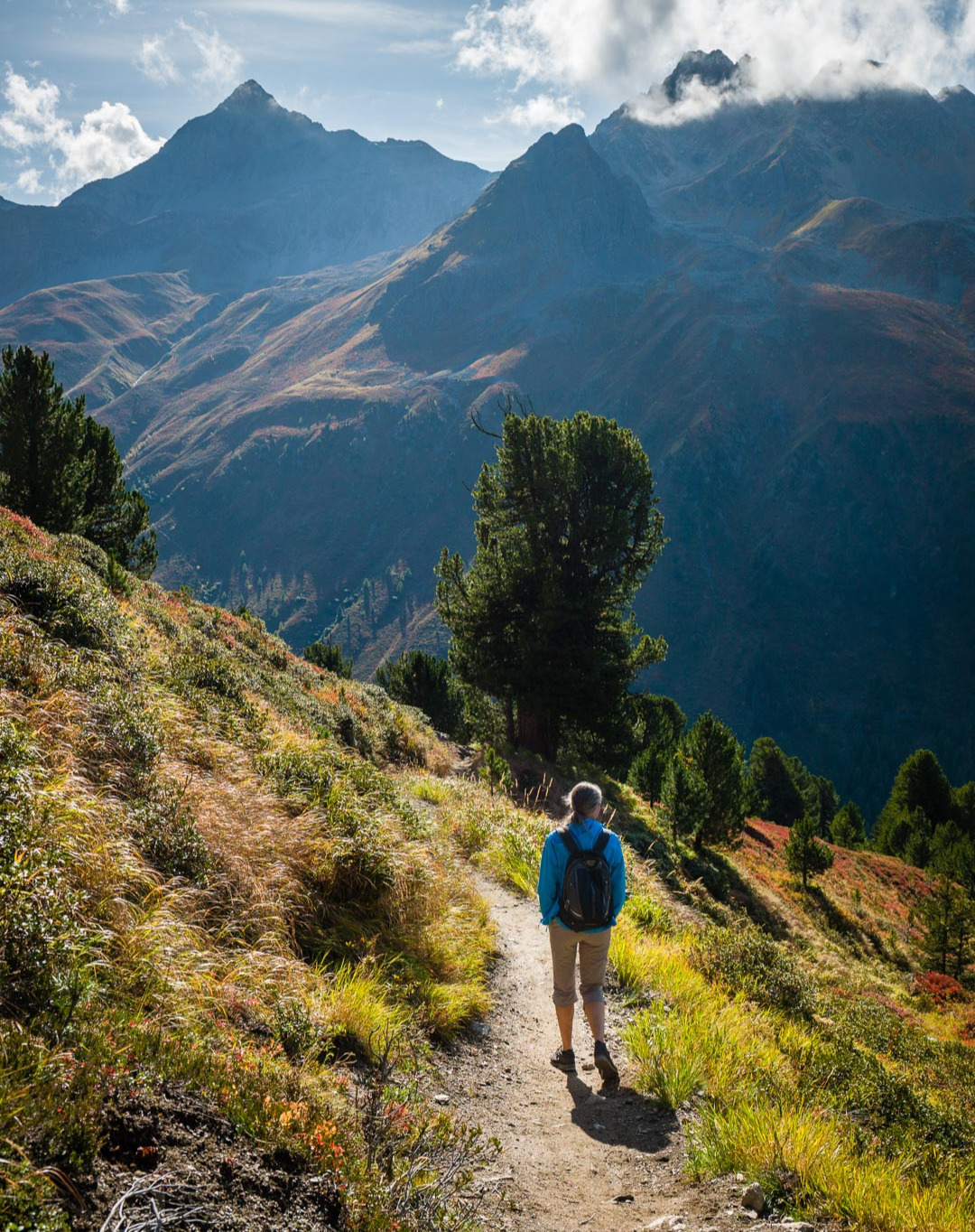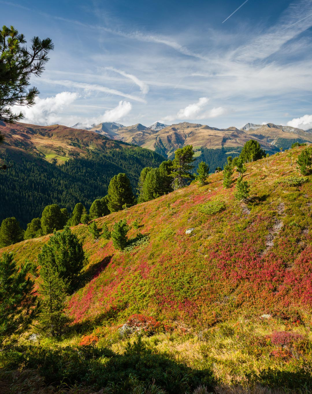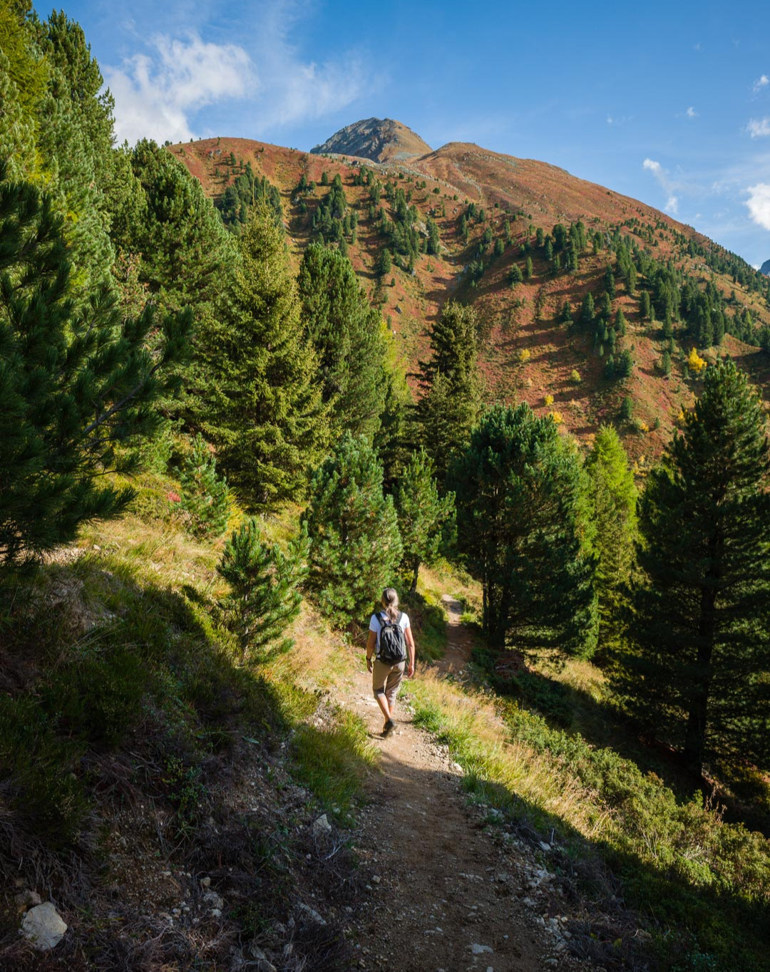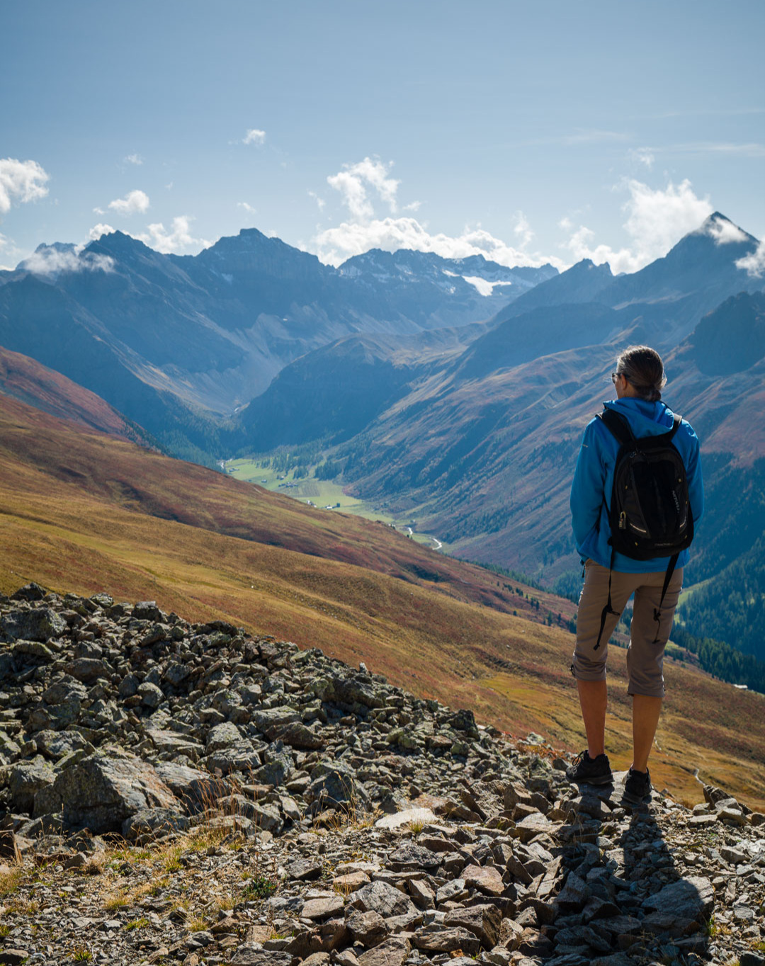 Wanderung vom Jakobshorngipfel ins Sertigtal inmitten einer farbenprächtigen Herbstlandschaft.
