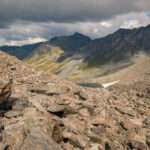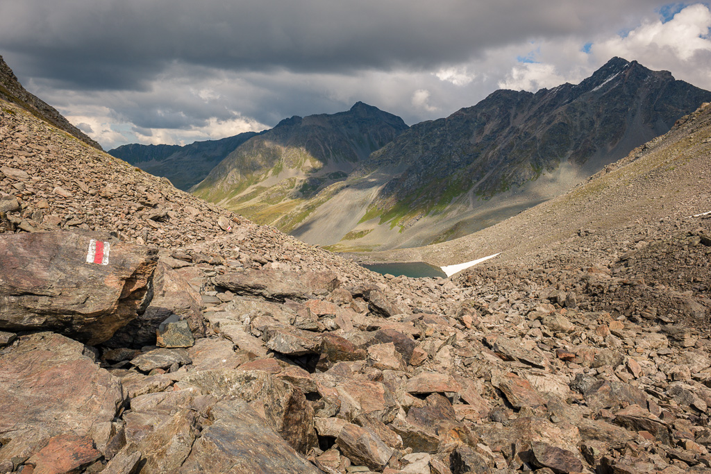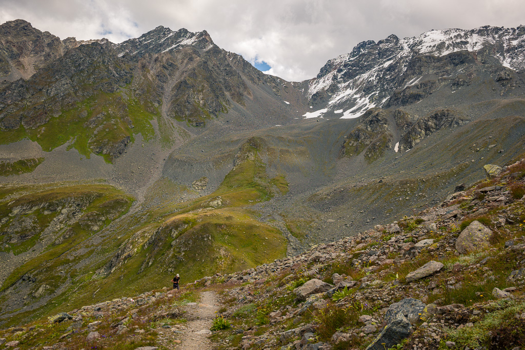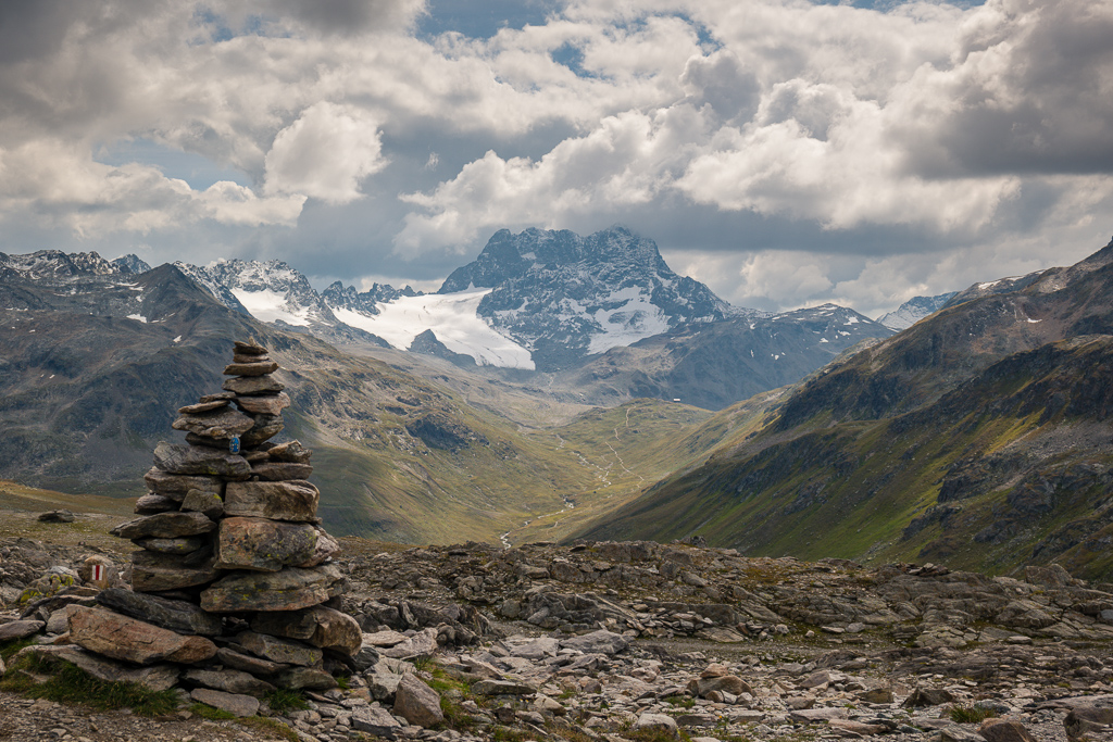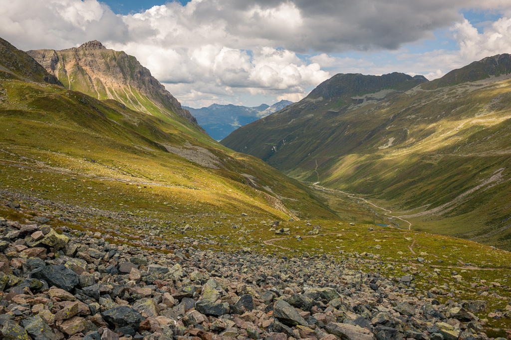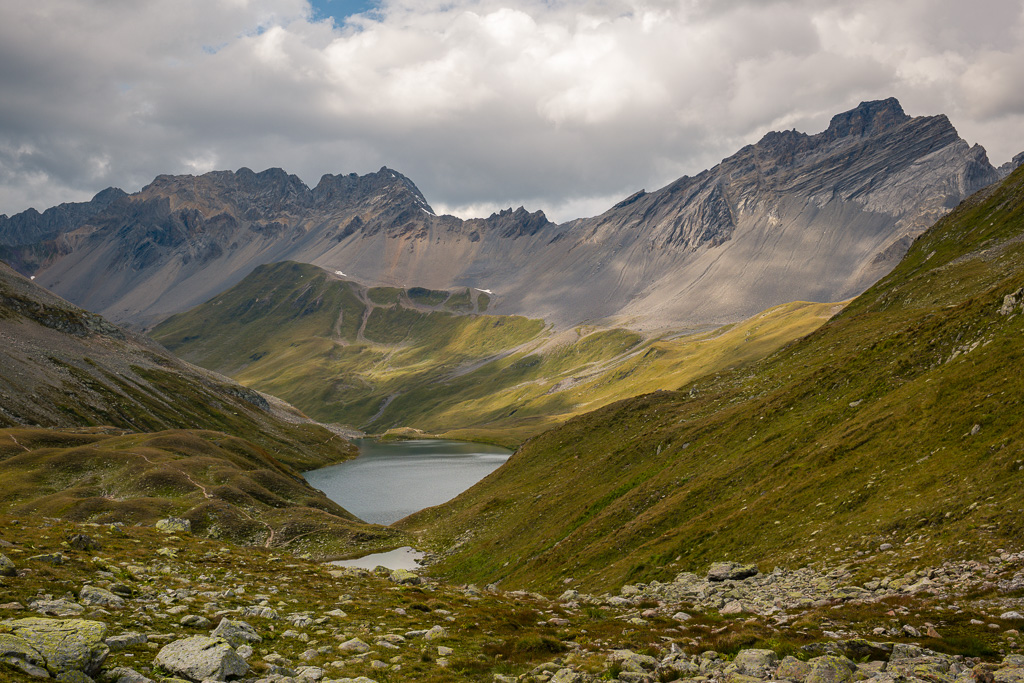 Danach wird der Weg schmaler und windet sich steiler hinauf durch grobes Blockgeröll, zuletzt an einem kleinen Geröllsee vorbei hinauf zur Passhöhe vom Sertigpass. Hier erblickt man ein gewaltiges Bergpanorama; im Mittelpunkt der vergletscherte Piz Kesch mit der Keschhütte darunter.
