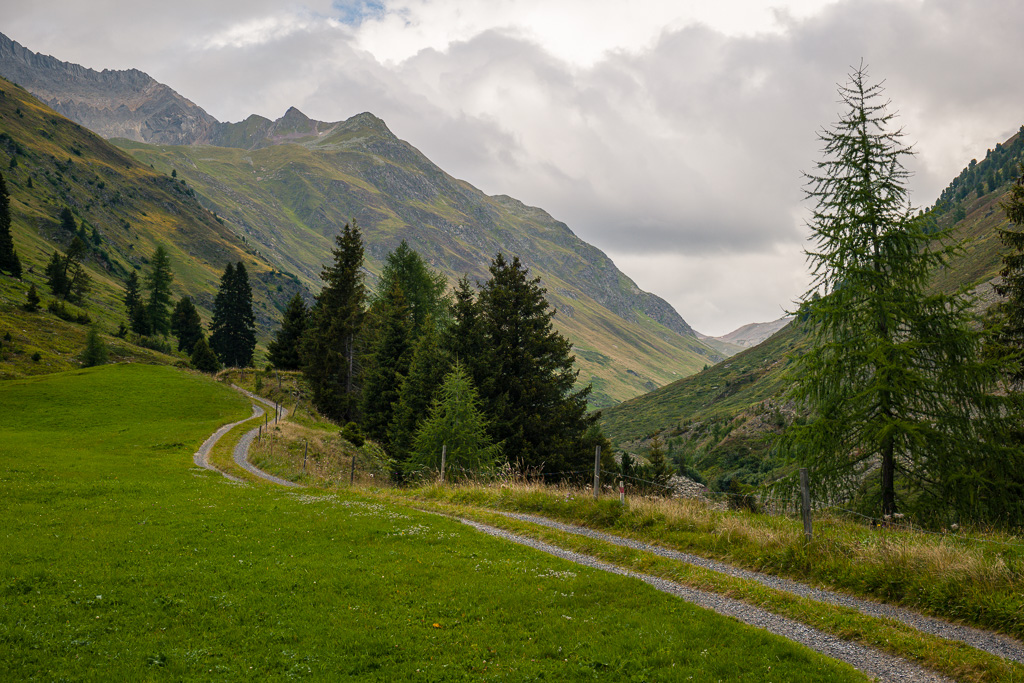 Von Sertig-Sand auf der asphaltierten Strasse noch etwas weiter Richtung Talende zur Weggabelung, wo der Alpweg in Richtung Sertigpass abzweigt. Auf dem breiten Weg mässig ansteigend ins weite Chüealptal hinein. Unterwegs kommen wir beim langgezogenen Kuhstall «Bim Schära» vorbei und etwas später auch zum kleinen Grünsee.