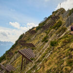 Bei Unterchäseren wähnten wir uns endlich am Ende aller Mühen, folgte doch nun auf dem Höhenprofil die schon andauernd herbeigesehnte grosse Abfahrt hinunter nach Weesen. Tatsächlich ging es ab jetzt bergab, aber nicht so, wie wir es uns erhofft hatten. Statt einem entspannt befahrbaren Alpweg erwartete uns ein steiler Karrenweg mit einer Unterlage aus losen und groben Steinen, die nur wie auf rohen Eiern und mit vorsichtigstem Bremseinsatz überquert werden konnte. An der Grenze der Reifenhaftung rutschten und schlingerten wir in die Tiefe, bis die Steine einem hellbraunen Strassenbelag wichen, der in engsten Kurven und wild geneigt wie eine Rutschbahn im Wellenbad hinabführte. Danach nahm das Gefälle endlich ab, und weiter unten mündete unser wilder Trail in eine handzahme Alpstrasse ein, auf der wir endlich unsere entspannte Abfahrt nach Weesen nachholen konnten.