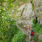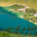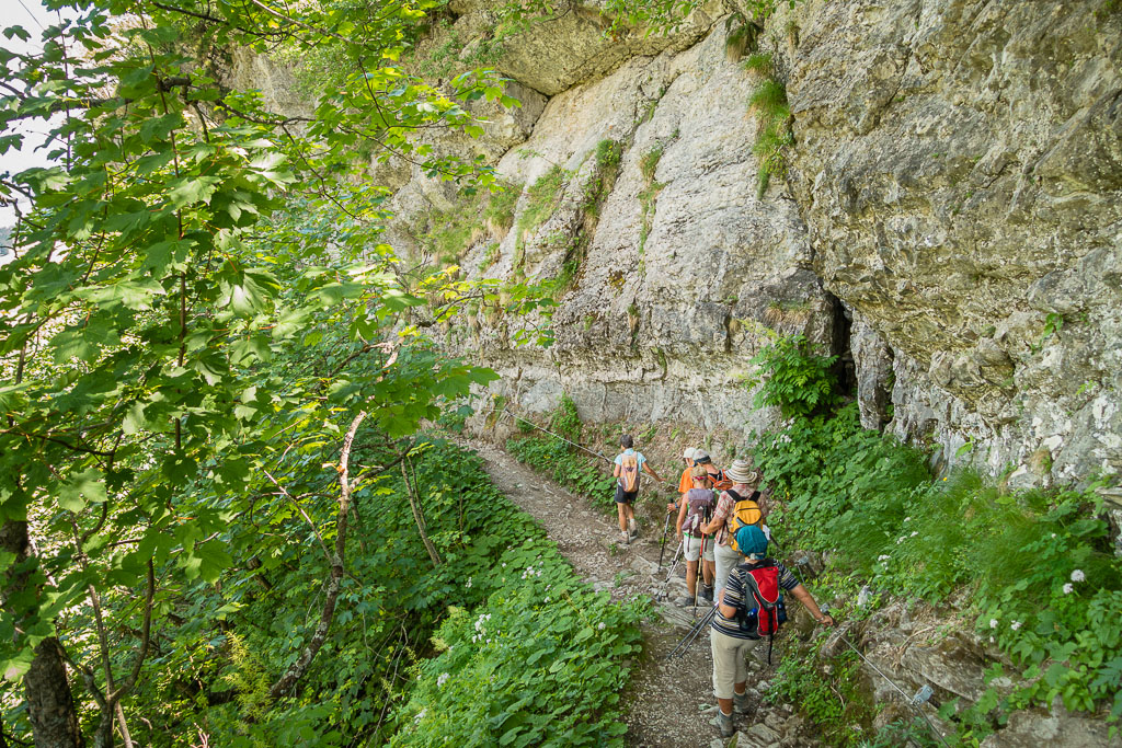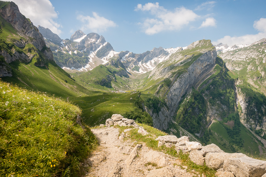 Auf dem gleichen Weg zunächst wieder zurück, bis nach 800m ein Weg hinunter zum Seealpsee abzweigt. Über zahlreiche Stufen und drahtseilgesicherte Abschnitte zunächst unter eindrücklichen Felswänden, später leichter durch Wald zum See absteigen.