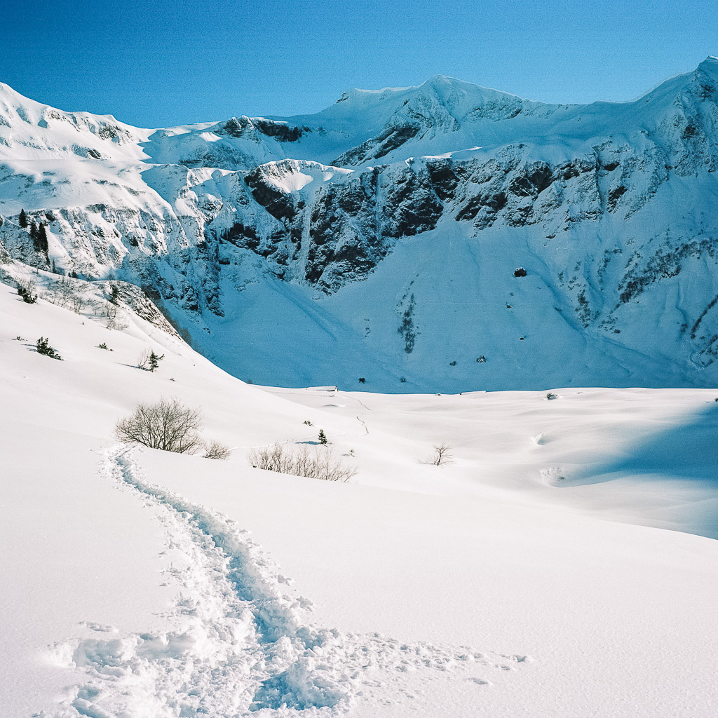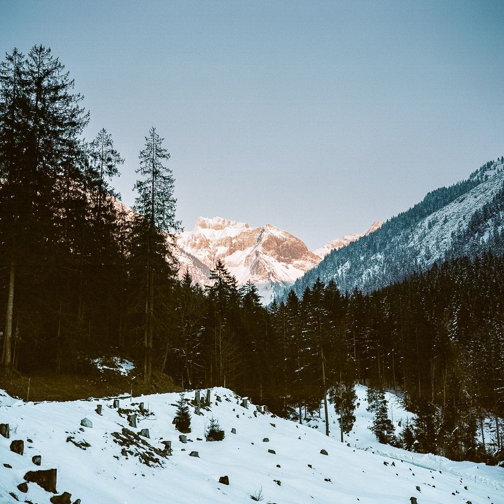 Schneeschuhtour in alpiner Umgebung jenseits des vielbesuchten Oytals bei Oberstdorf.
